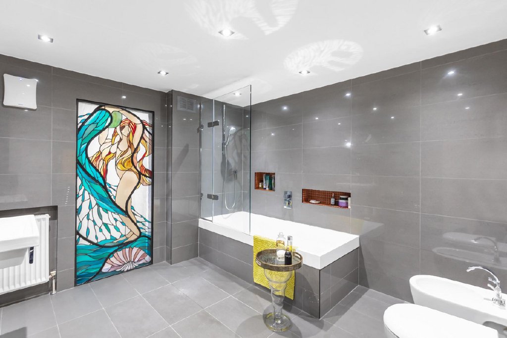 The allure of this exceptional residence, adorned with lofty ceilings throughout, unfolds within a welcoming entrance hall showcasing resplendent original flooring. The main level unveils a captivating bay-fronted reception room leading to a stylish shower room/guest cloakroom, an expansive utility room, and a delightful kitchen/dining area bathing in natural light. The kitchen seamlessly connects to the garden, creating a seamless indoor-outdoor flow. A second double bay-fronted reception room gracefully transitions into a stunning dining area, characterized by a floor-to-ceiling glass panel that bathes the room in radiant light. An added bonus, the basement provides ample storage and versatile usage.