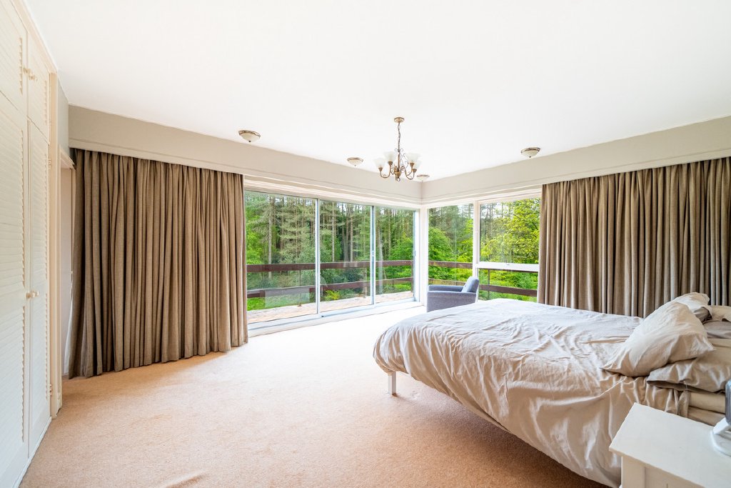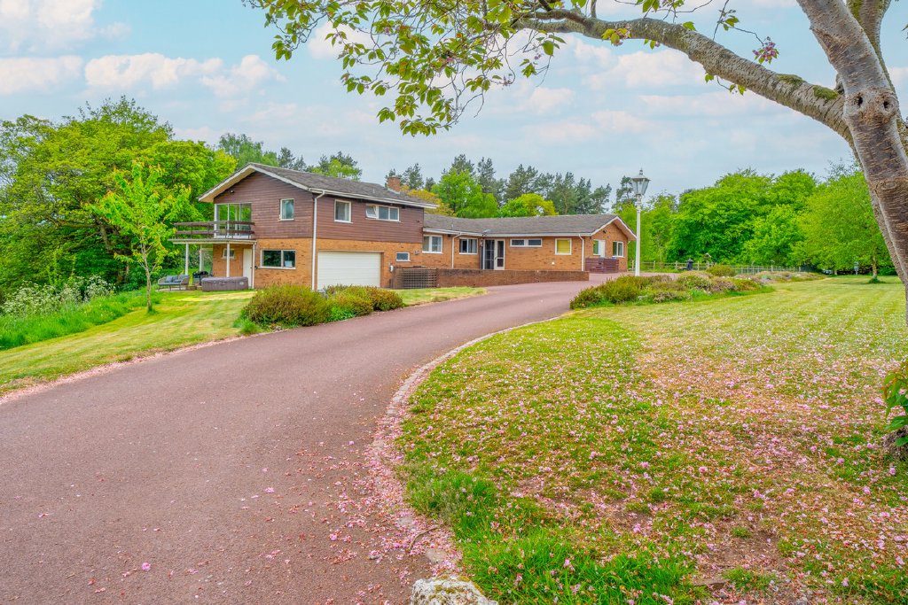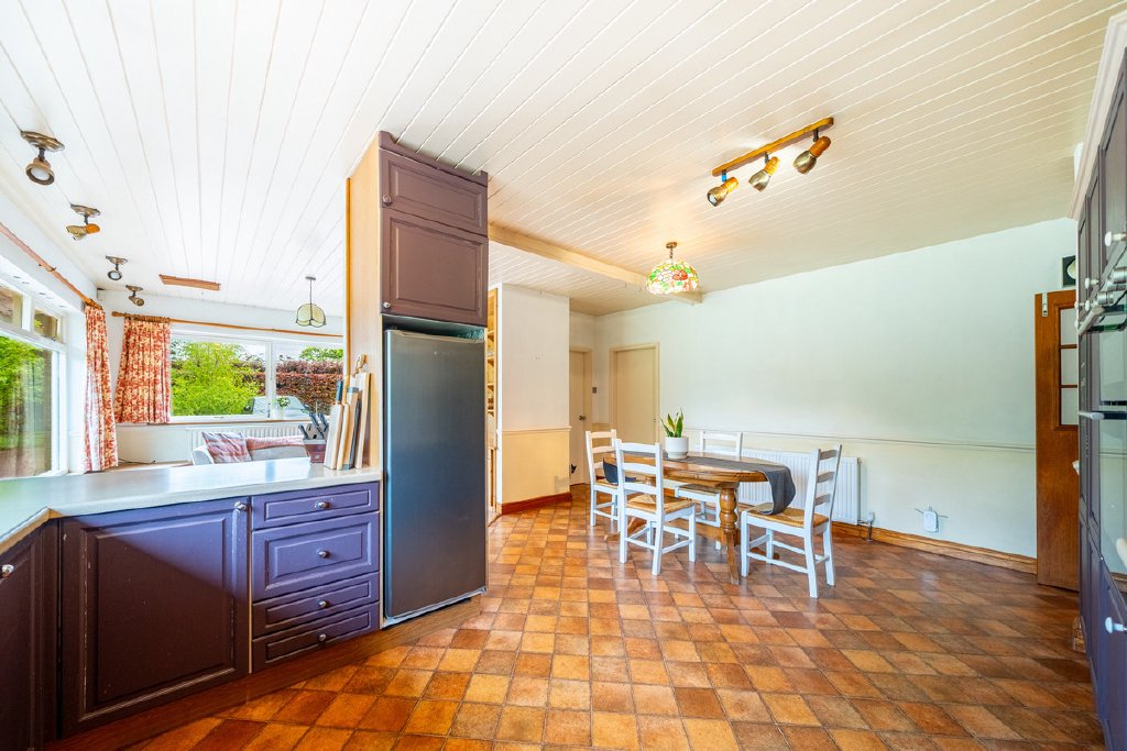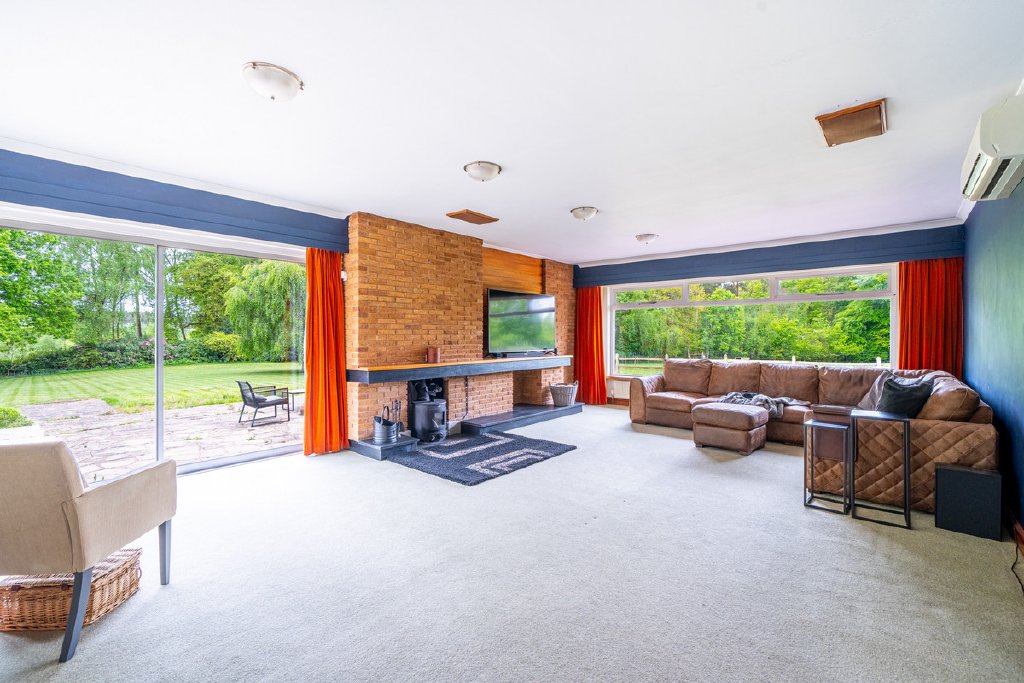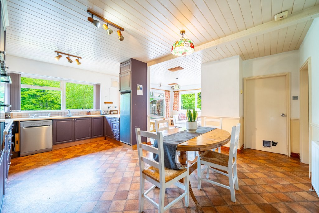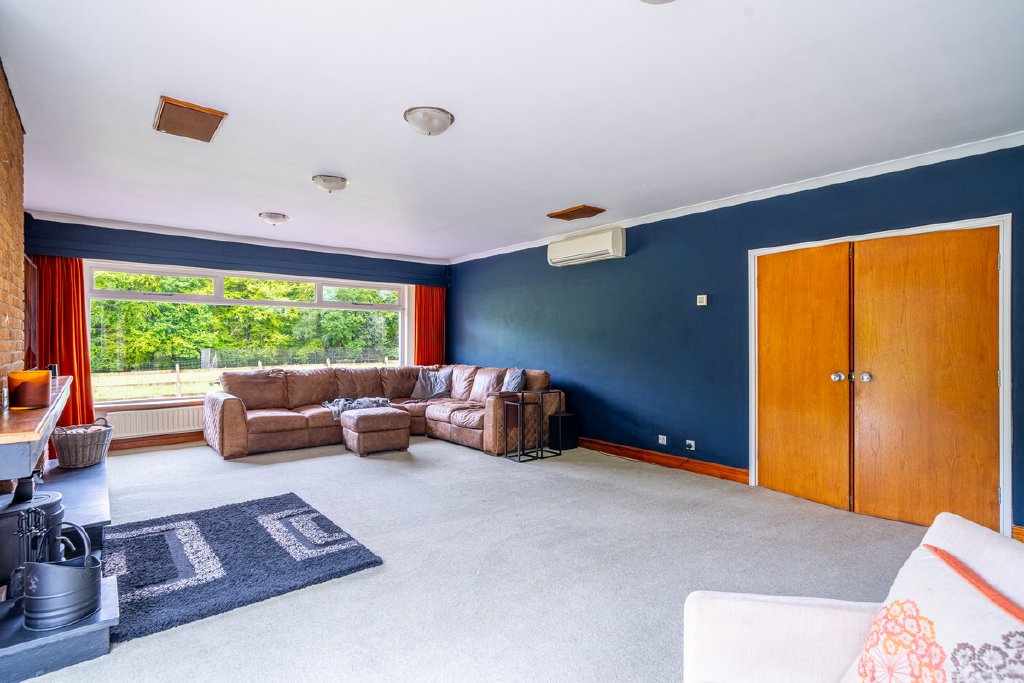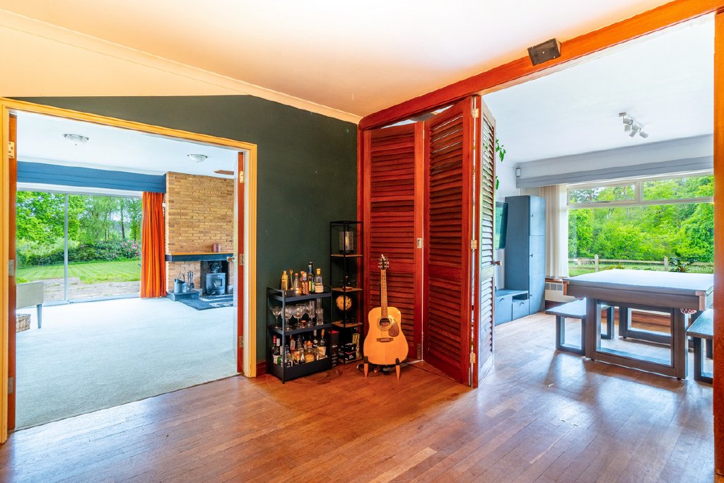 Predominantly single-storey with a partial split-level design, the property currently provides substantial and well-planned accommodation. All principal rooms command fine views over the surrounding grounds and neighbouring woodland, offering an excellent framework for future renovation.