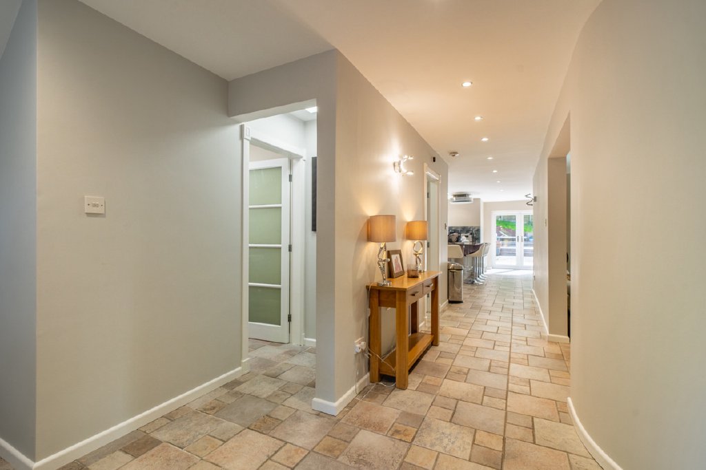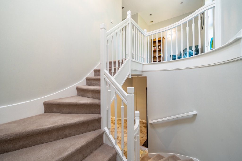 A striking curved wall leads you to a sunken lounge—a beautifully cosy and refined space, finished with plush pure wool carpet and flooded with natural light. To the rear, the bespoke kitchen is the heart of the home, boasting a Quooker boiling tap, induction hob, three ovens (including microwave and warming drawer), handmade glass splashback, and mood lighting.
