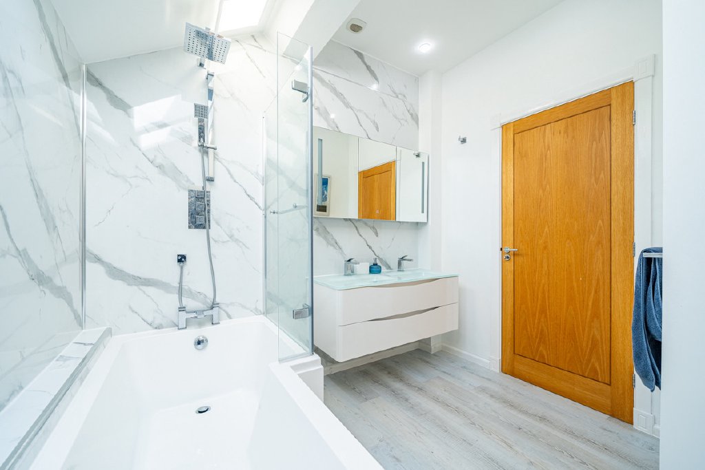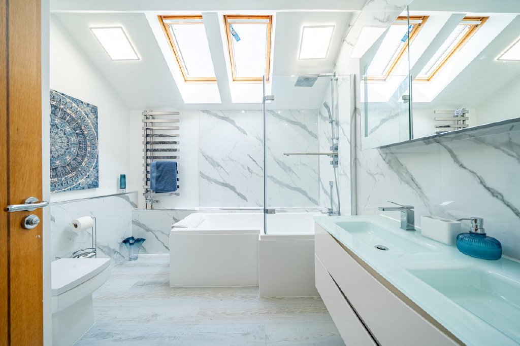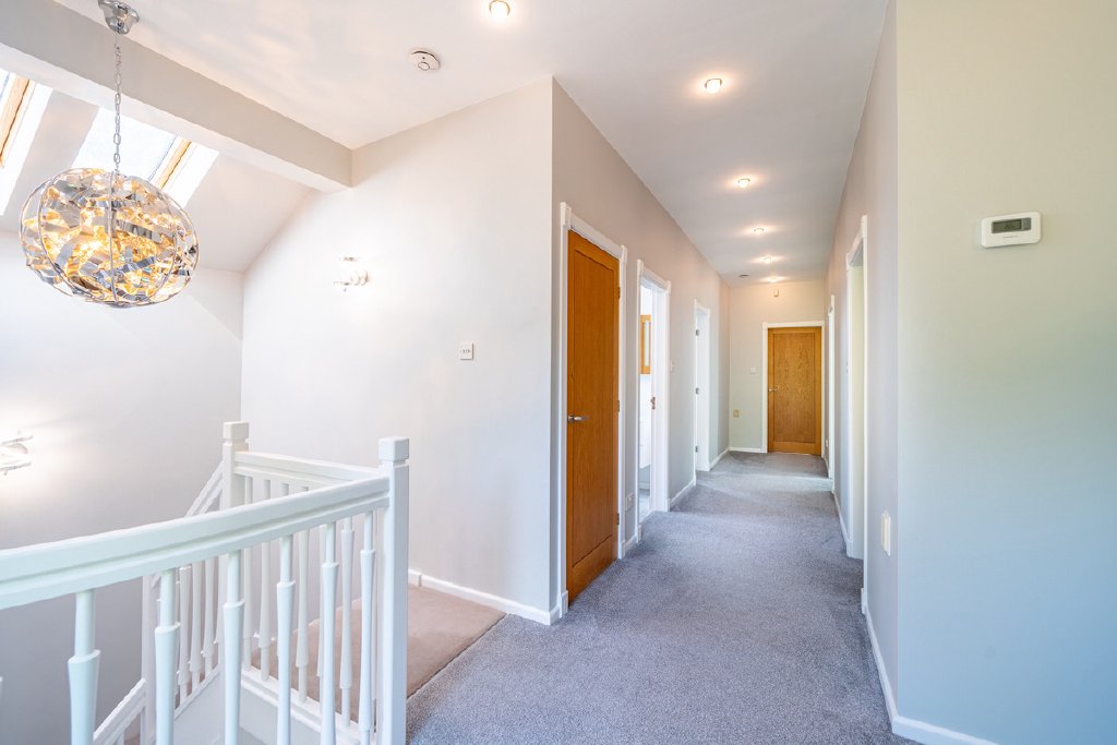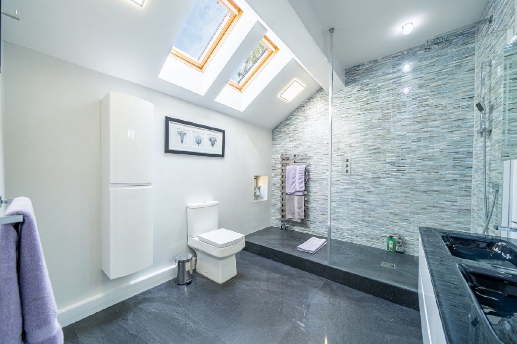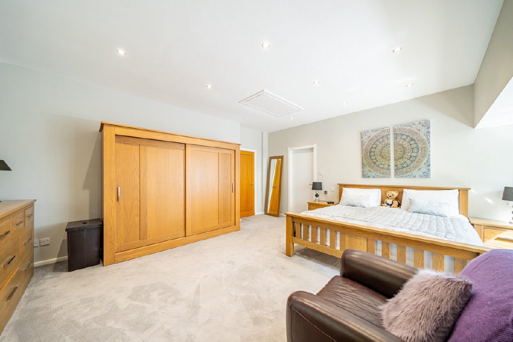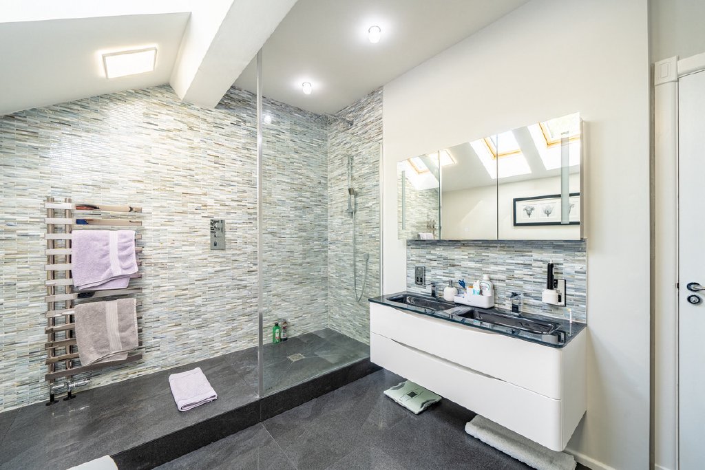 Upstairs, a staircase rises to a mezzanine-style landing and a spacious upper floor. The luxurious master suite enjoys dual-aspect windows, an en-suite bathroom with double sinks and walk-in shower. Two further generous double bedrooms share a breathtaking family bathroom, while a separate mid-level room — currently used as a study with its own en-suite — could easily serve as a guest suite, games room, or annex