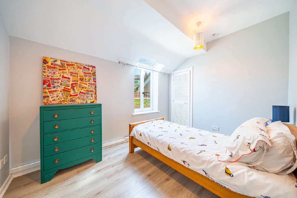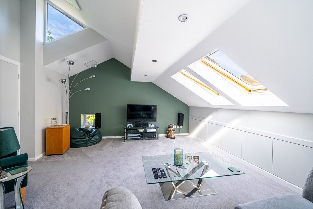 Off the kitchen lies a glamorous dining room, ideal for hosting. A versatile garden room, fully powered with its own fuse board, offers the perfect office, studio, or guest space.