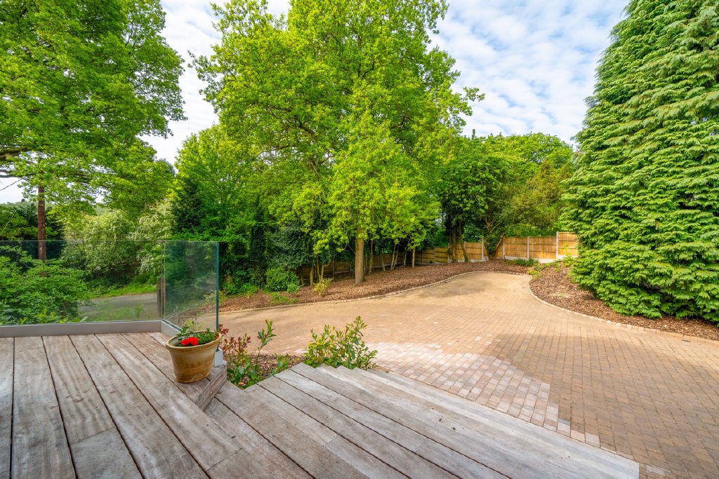 The vast block-paved driveway provides ample parking for multiple vehicles and leads to a large double garage beneath the main living accommodation.
