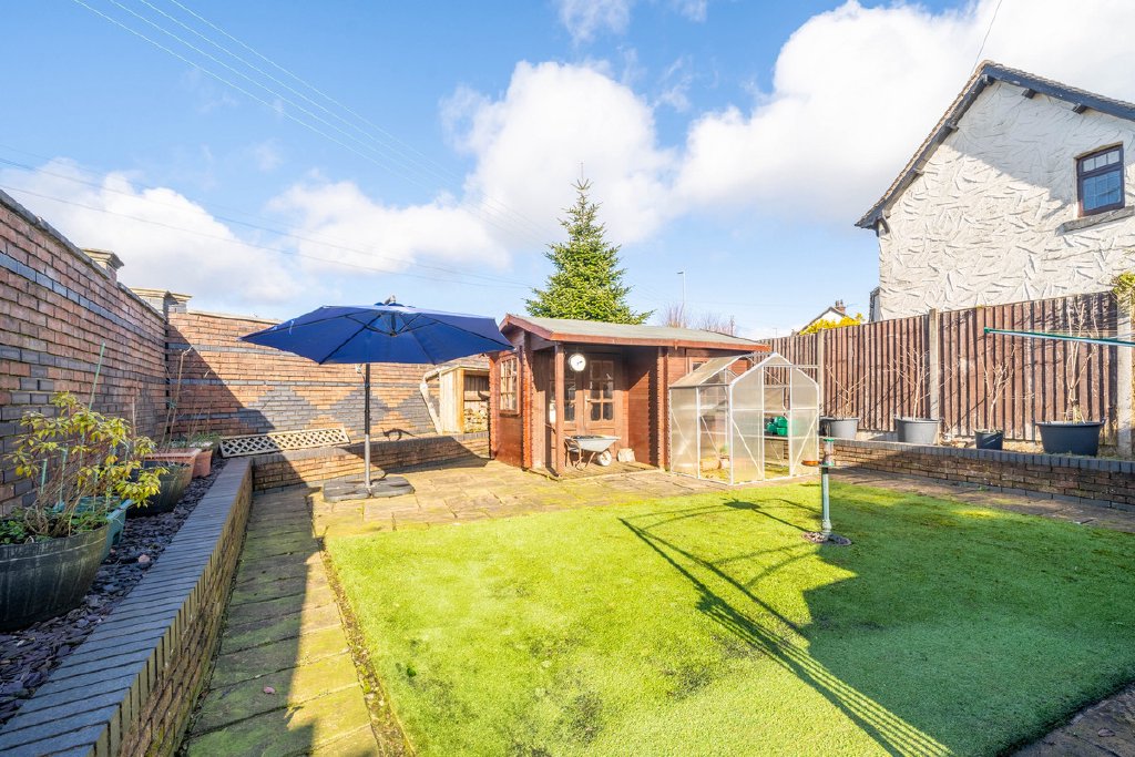 Externally, The Dainty boasts a neutral white facade with sleek black window frames and a dark grey tiled roof. A covered porch supported by pillars enhances the entrance, while privacy is ensured with a surrounding brick wall and mature hedging. The detached garage offers parking and storage, and the rear garden features artificial turf and paved areas for low-maintenance enjoyment. A brick wall with alternating red and dark grey bricks adds character, complemented by a wooden shed and greenhouse for gardening enthusiasts.