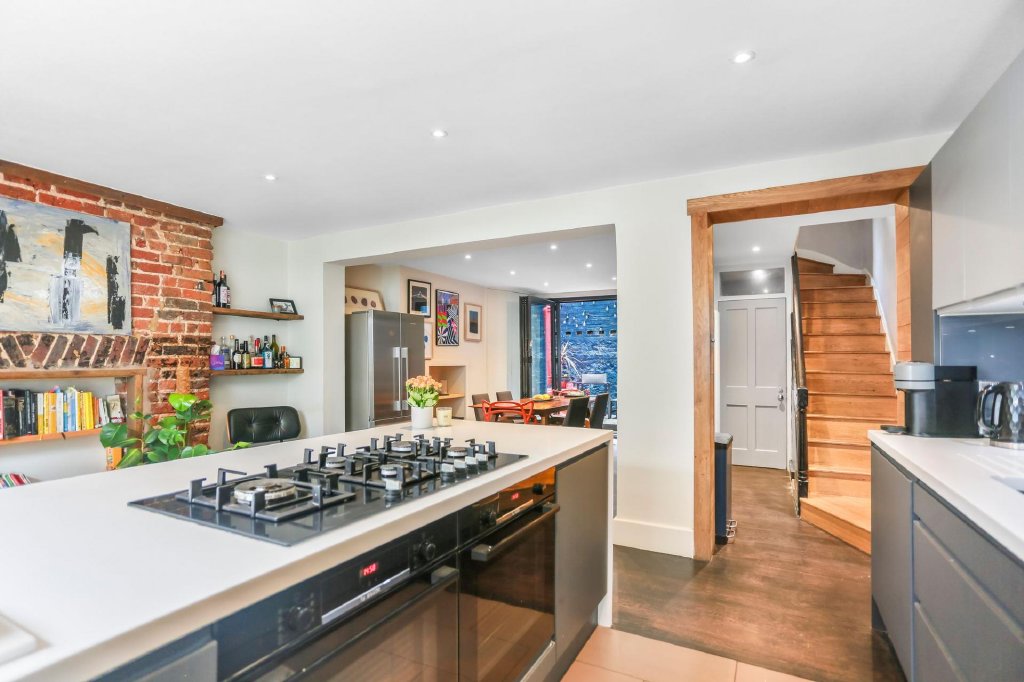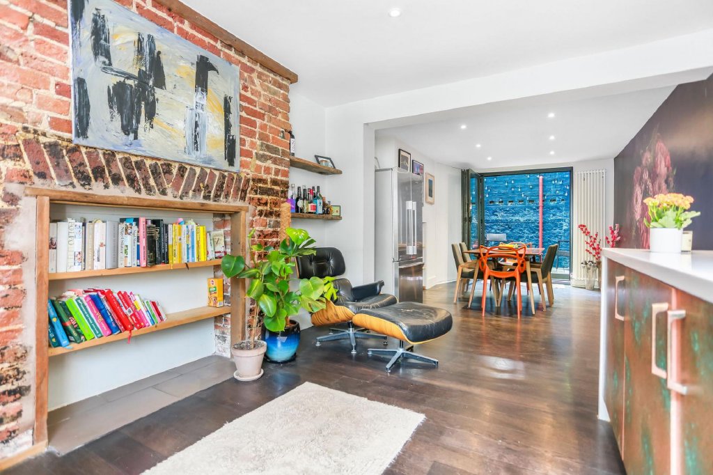 The sense of style continues in the large dining/living area where an additional exposed brick chimney breast adds a warm and welcoming feel. Offering ample room for a family dining table, this open plan floor provides a fantastic space for entertaining, with French doors opening onto a decked terrace, perfectly extending this sociable space still further.