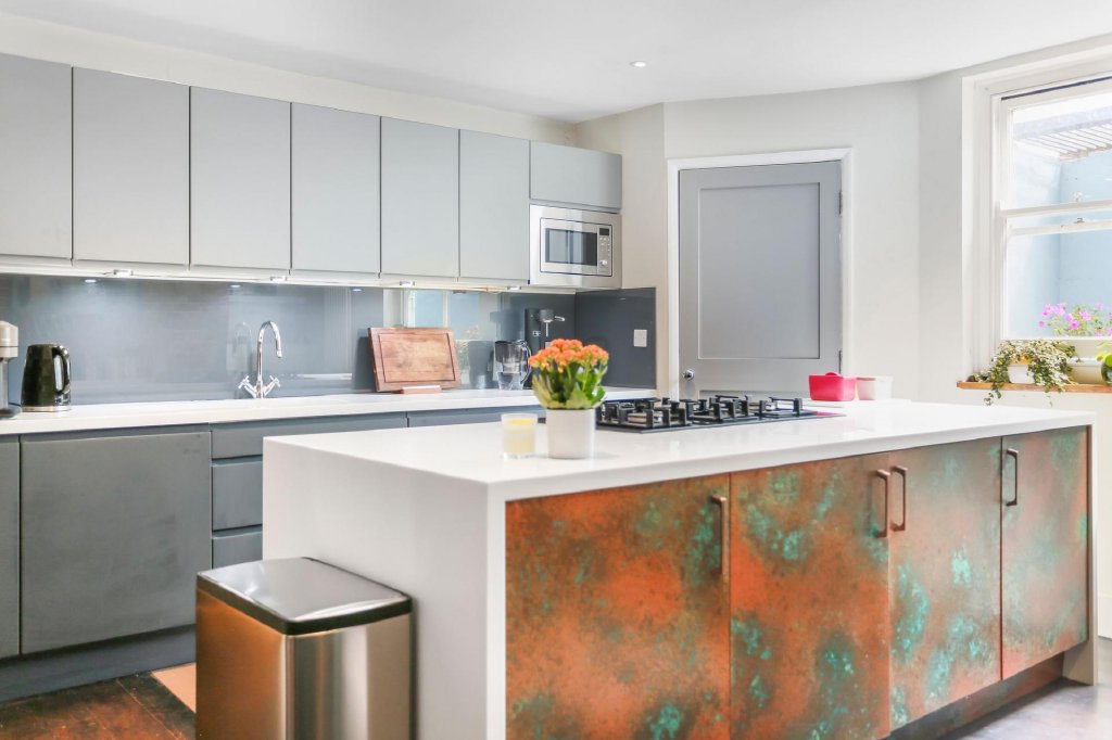 Sleek dove and dark grey cabinets and countertops in the stylish kitchen area nestle beneath richly toned stone splashbacks and provide ample room for freestanding appliances. Effortlessly delineating this impressive space, stone countertops wrap around a deep kitchen island featuring an integrated gas range hob and ovens, while the original coal hole has been cleverly converted into a convenient walk-in pantry.