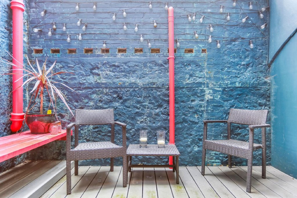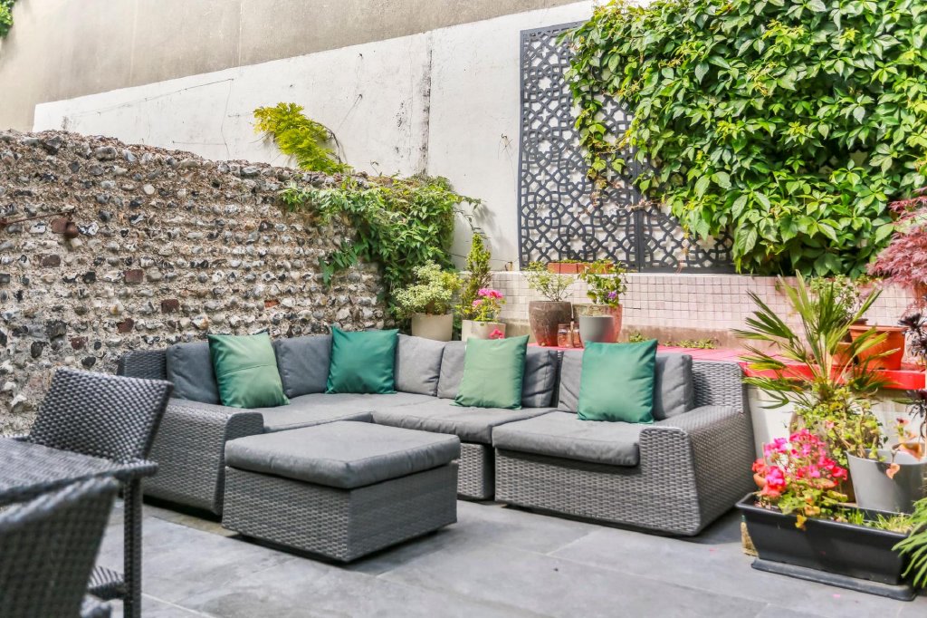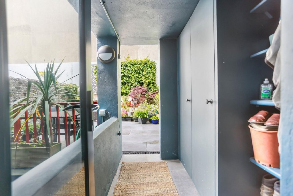 A demi-glazed door open onto a highly private and contemporary styled courtyard garden that instantly engenders an easy flowing extension of the ground floor. Encompassed by tall bungaroosh walls, the clean lines of stone tiles and modern raised flowerbeds easily match the attention to detail of the impressive interior and offer plenty of space for outdoor meals and evening drinks. A verdent drenched wall cocoons the garden, while modern outdoor storage cupboards offer the perfect space for bikes and furniture.
