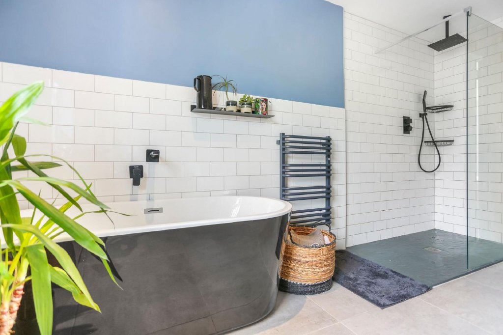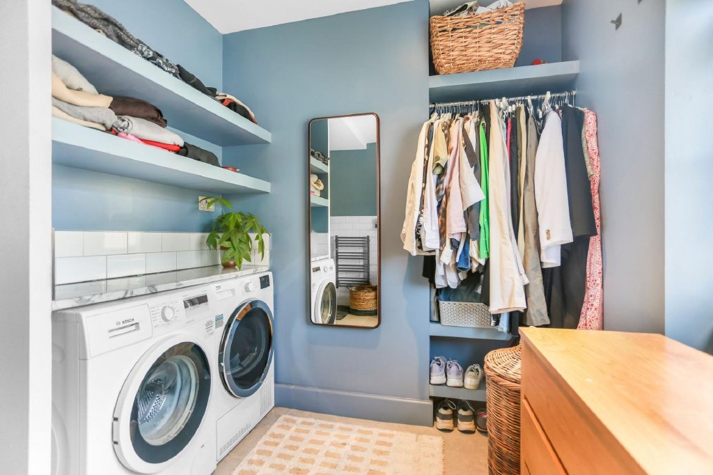 Cleverly positioned alcove cabinets provide a wealth of storage without encroaching on the ample floor space. In the ensuite, stone tiles combine with feature indigo walls in separate basin and walk-in shower areas, where a rectangular countertop basin, black freestanding bath and ceiling mounted rain shower head add a spa-like feel to this sympathetically presented home. Benefiting from plenty of height and space, this stylish en suite includes a discreet dressing area complete with an abundance of open wardrobes, along with a utility area conveniently sized for a washing machine and tumble dryer.
