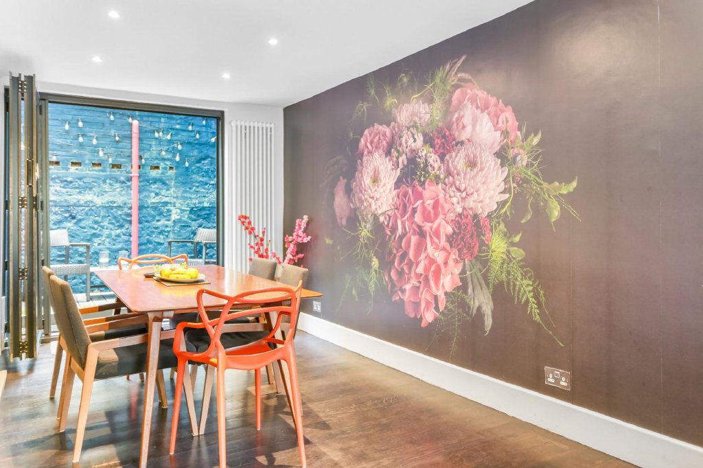 Highly versatile and sociable, the dual aspect open plan dining and kitchen space, with its engineered wood floor, statement floral wallpaper and oxidised copper accents adds a contemporary twist to this beautifully presented period property.