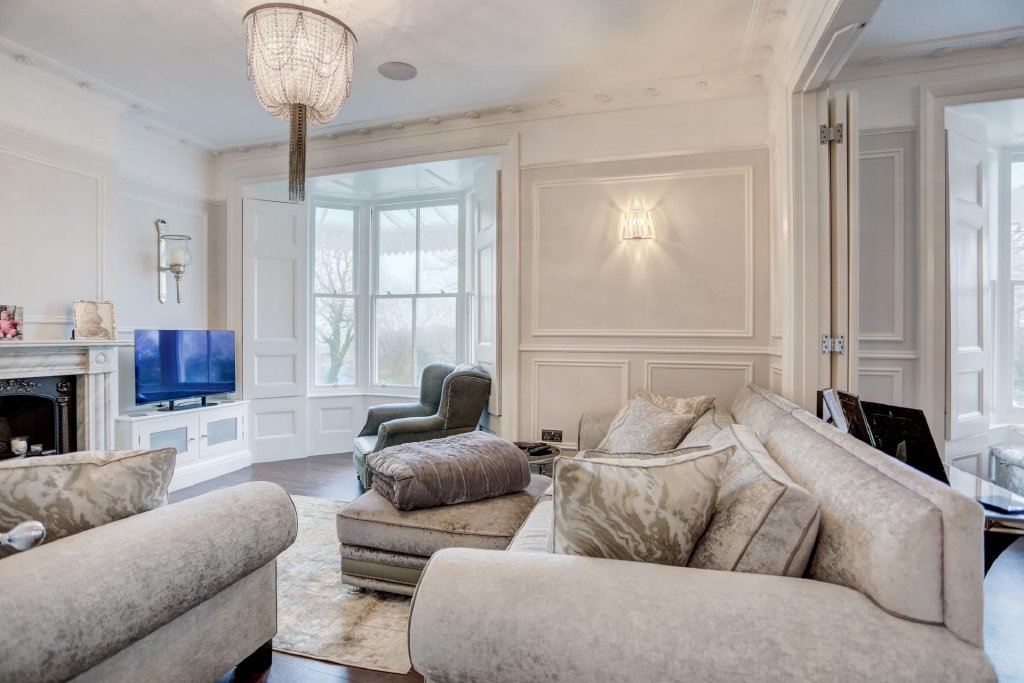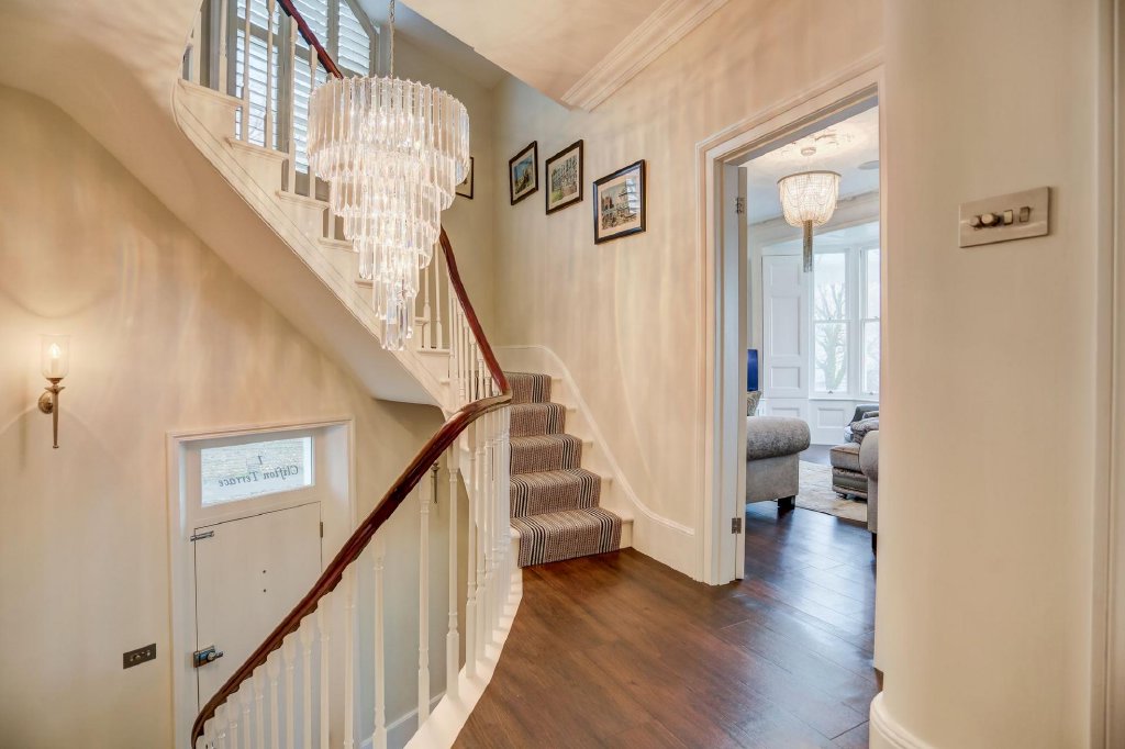 The stunning staircase showcases the grand rooms leading off of it, with a spectacular chandelier at the very top. The second reception room spans the entire width of the property, making it an exceptional space for entertaining and relaxing. Its allure is only emphasised by the vast views across Clifton Gardens, down to the sea. In addition, there is a a good size bedroom or useful study at the rear of this landing, as well as a bathroom with a walk-in shower.
