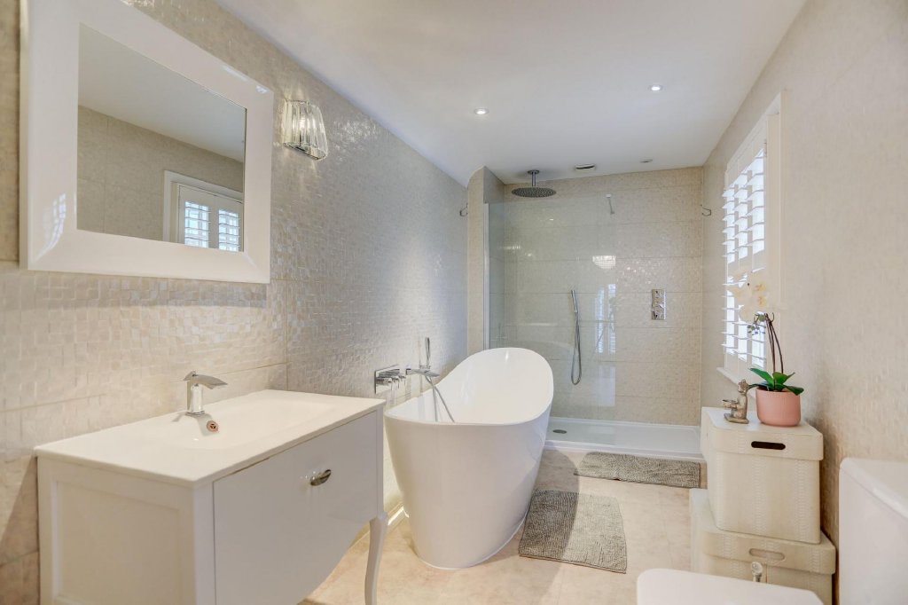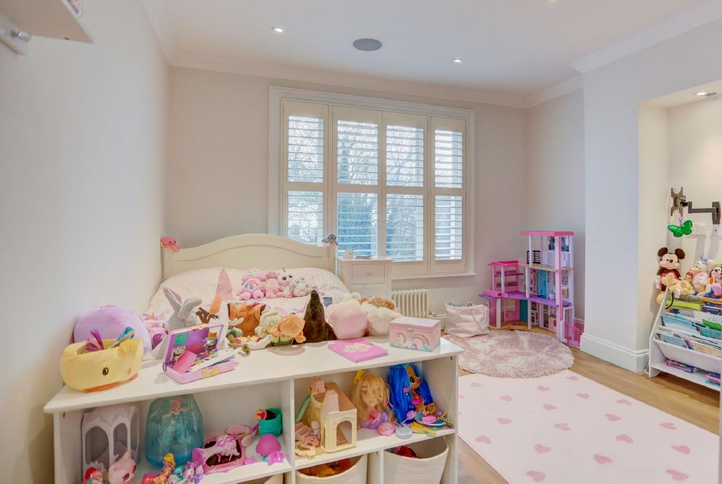 Continuing to the second floor, there are a further three double bedrooms. Each room has thoughtfully arranged built-in cupboards and storage areas and make the most of natural light. This floor also boasts a family bathroom with a free-standing bath.