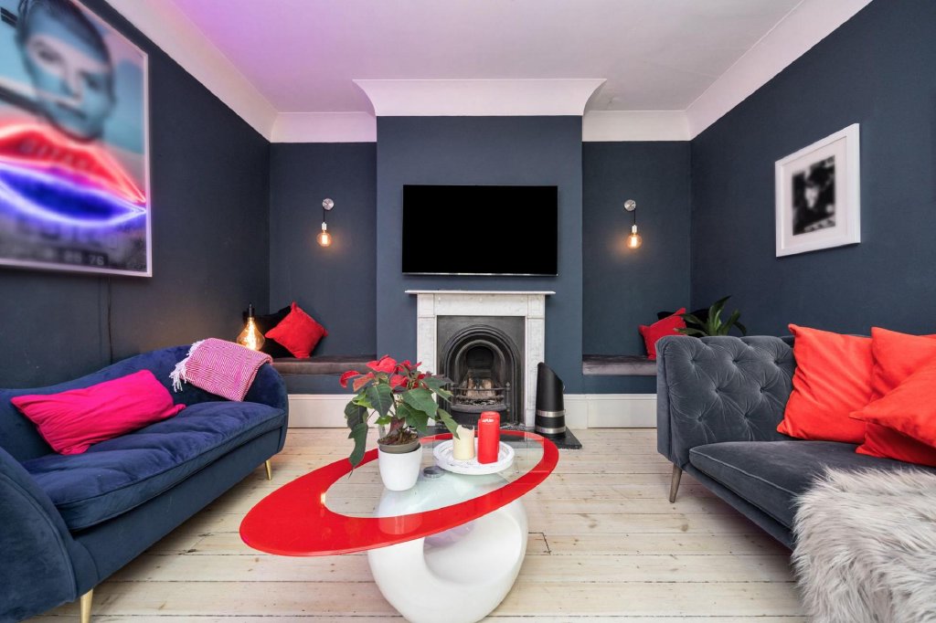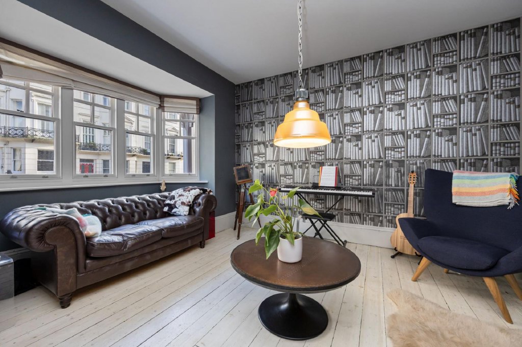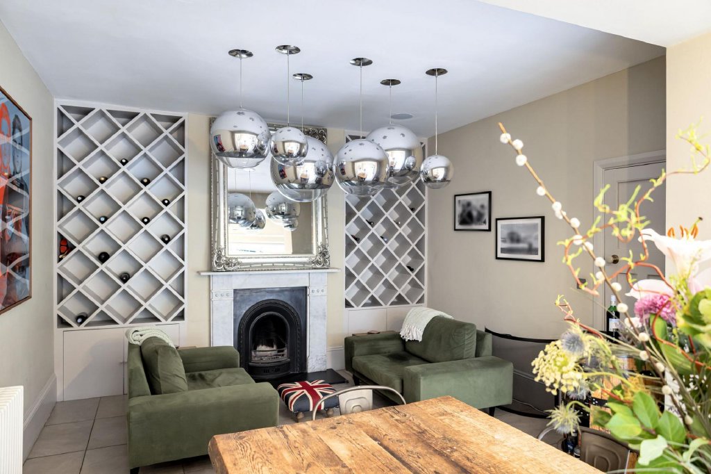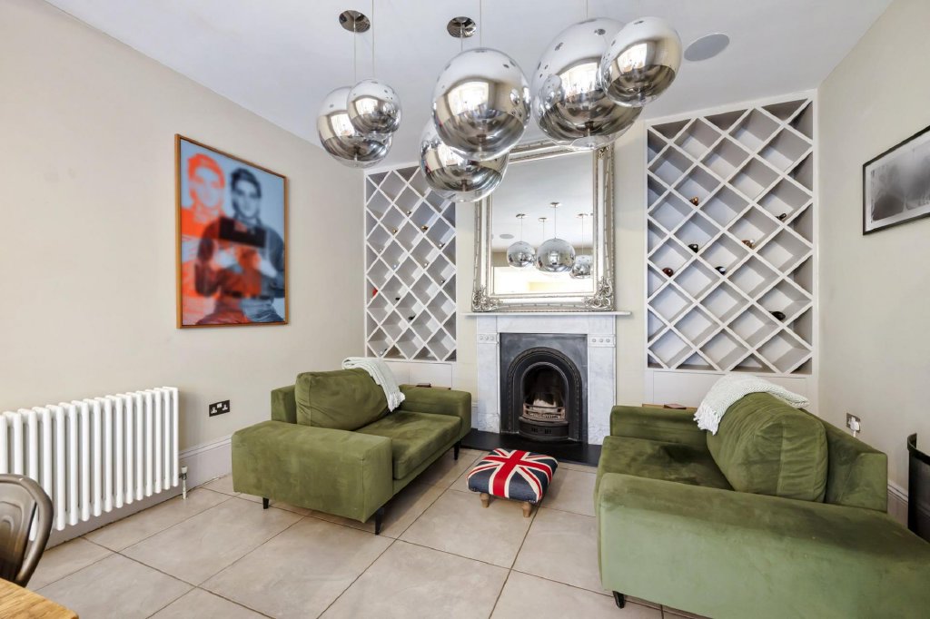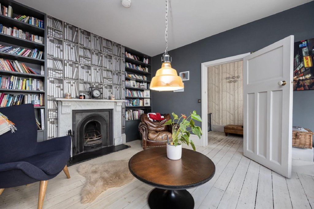 To the left and right of the entrance hall are two spacious and symmetrical reception rooms. One features a large bay window, while the other boasts triple sash windows—each replaced with high-quality timber-framed double glazing. The first room, painted in Farrow & Ball's Stiffkey Blue, is a warm and inviting space perfect for cozy movie nights, complete with a marble fireplace and wall-mounted TV. Opposite, the formal sitting room is more refined, adorned with Cole & Son’s Ex Libris wallpaper, built-in bookshelves, and another stunning marble fireplace. A statement industrial pendant light adds contemporary flair.
