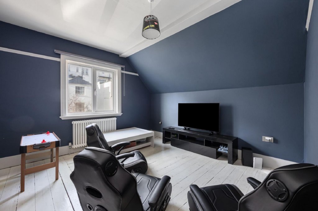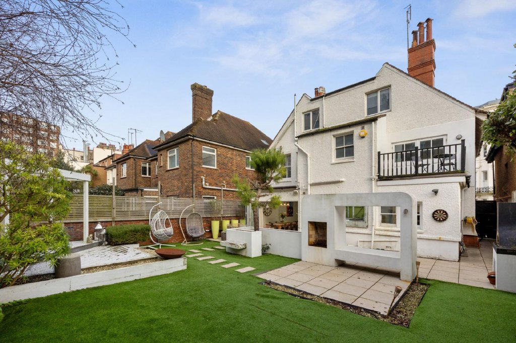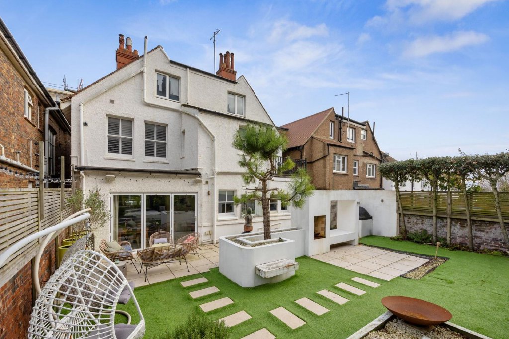 The west-facing rear garden is a tranquil sanctuary in warmer months, thoughtfully landscaped with mature borders, tall shade trees, and a stunning dual open fireplace. Multiple zones invite al fresco dining and socialising. Sunlight floods the space year-round thanks to its open southern aspect, complemented by balconies on both east and west sides of the home. Inside, the ground floor features three luxurious reception rooms, all elegantly decorated with Farrow & Ball tones and Cole & Son wallpapers, and each boasting a working open fire. With rare off-street parking for two vehicles, and within close proximity to top-rated schools and excellent transport connections, this property offers the pinnacle of coastal family living.