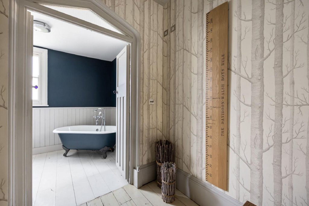Striking Ole & Son's Woods wallpaper featuring silver birch trees runs throughout the hallways and stairwells, creating a strong sense of continuity and vertical space. Farrow & Ball’s soft neutrals enhance the original woodwork and ornate architraves, while painted wooden floorboards flow through to the reception rooms.