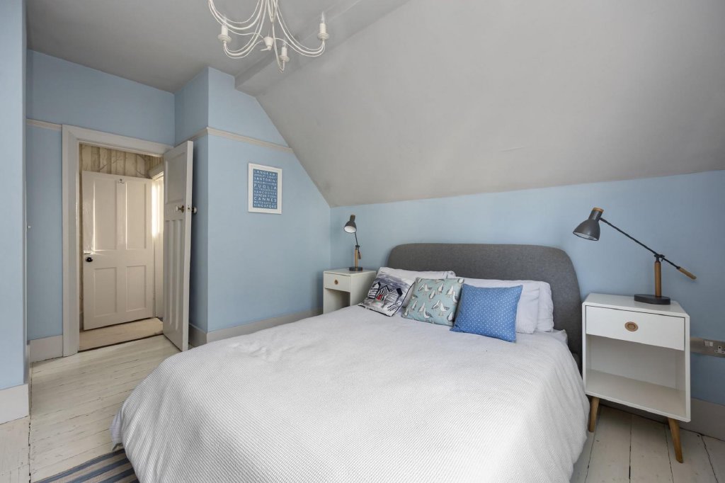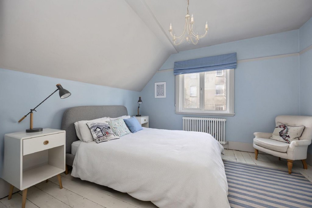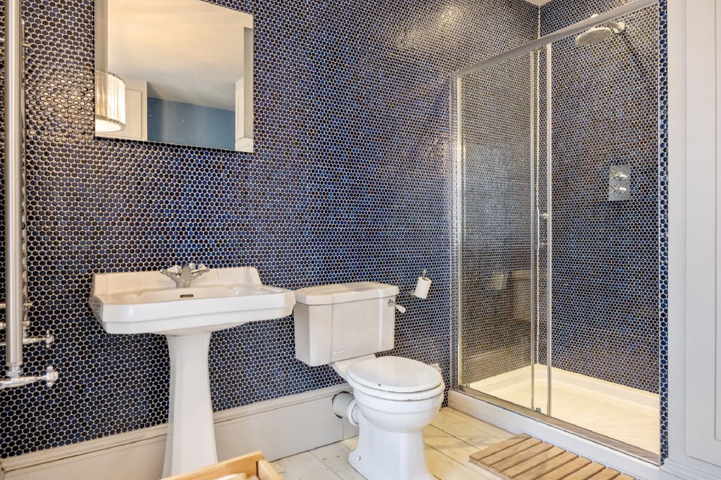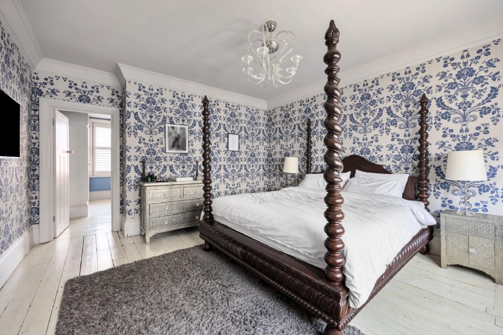 Stretching the full width of the first floor, the principal bedroom is a calm and sophisticated retreat. Its Regency-style wallpaper and blue-ivory colour scheme flow seamlessly into the luxurious en suite and dressing room. The bathroom includes a freestanding bath, separate rainfall shower, and shuttered windows for privacy. Built-in wardrobes provide excellent storage.
