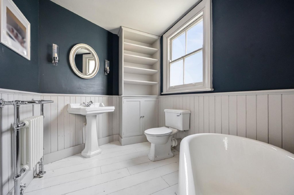 Continuing the home’s period theme, the first-floor landing leads to a large family bathroom featuring a freestanding claw-foot tub, panelled walls, traditional fixtures, and a linen cupboard. Two spacious double bedrooms sit on the south side—one facing east, the other west with balcony access. Currently children’s rooms, both offer flexibility in purpose and style, with wooden floors and double-glazed timber sash windows ensuring comfort and charm.