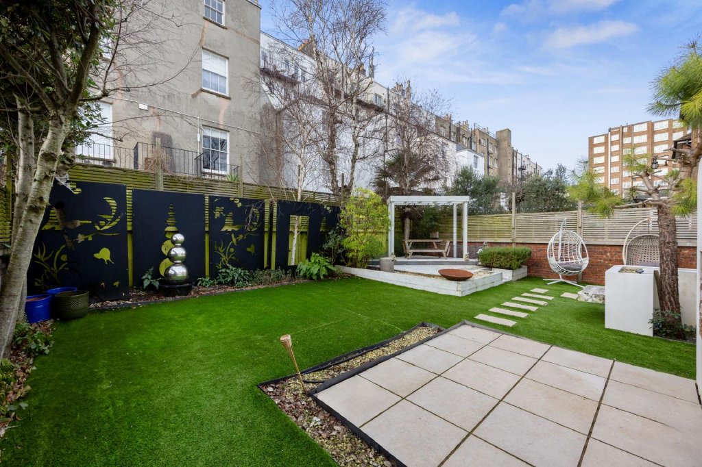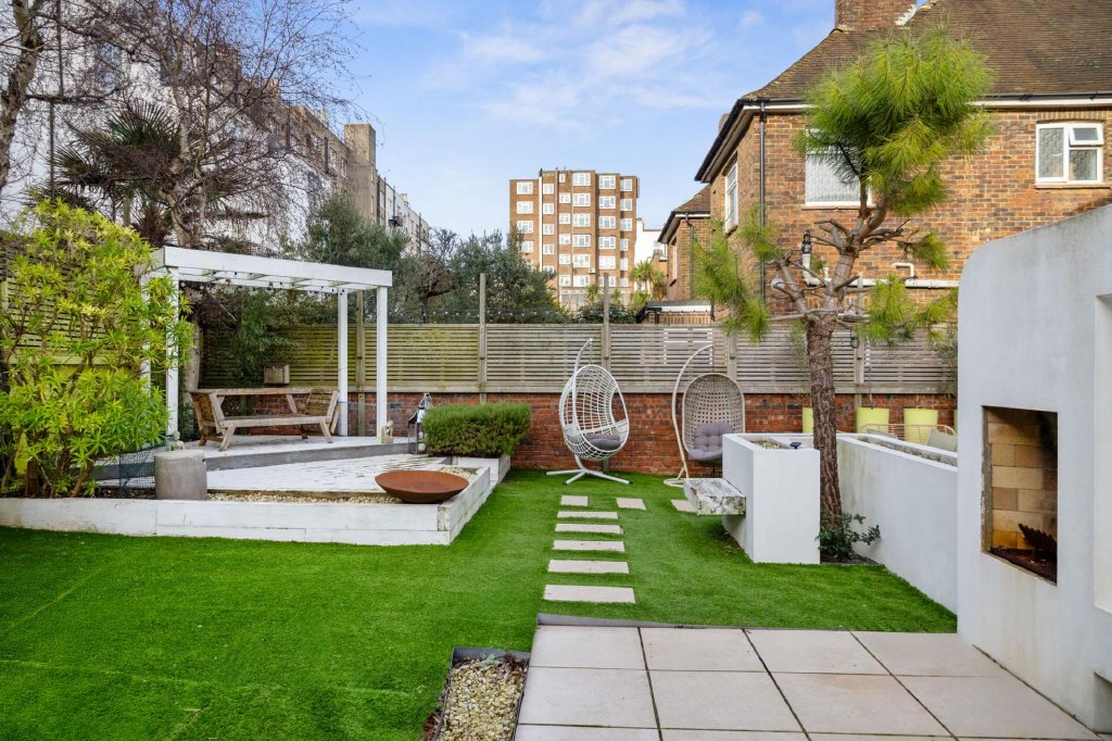 Spacious, sunny, and low-maintenance, this city garden is ideal for entertaining and family fun. Its mid-century design features a statement double fireplace separating the faux lawn from the patio. A pizza oven and smart lighting add year-round function and ambiance. Multiple seating areas take advantage of the sun's path, while clever landscaping offers colour, fragrance, and privacy. With its south-westerly orientation, it’s a serene haven where you can often hear the sea in the distance.