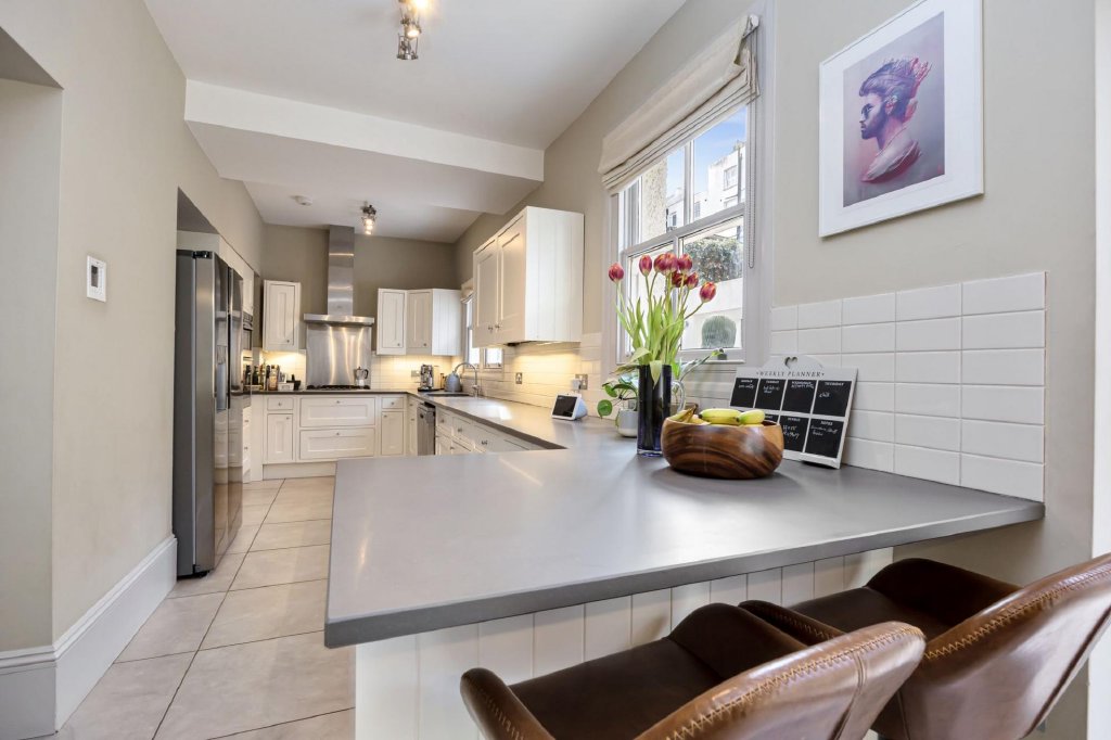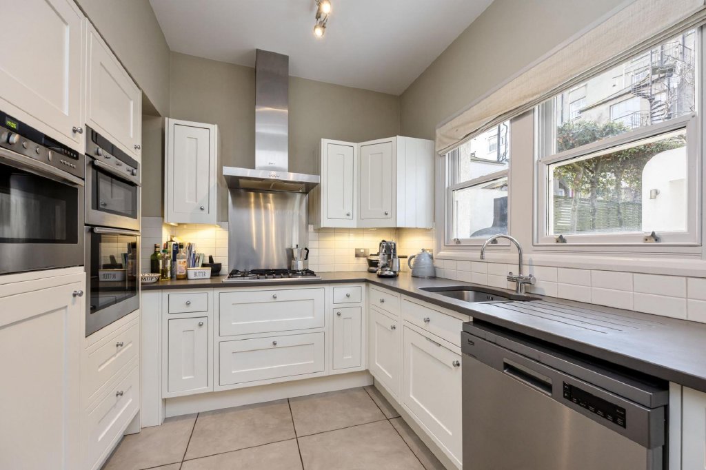 The kitchen runs along the rear wall, overlooking the garden. Solid timber Shaker-style cabinets are paired with grey quartz worktops and a sociable breakfast bar. The kitchen includes premium integrated appliances: gas hob, triple ovens, dishwasher, American-style fridge-freezer, and a sink—all included in the sale.