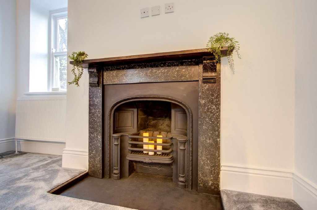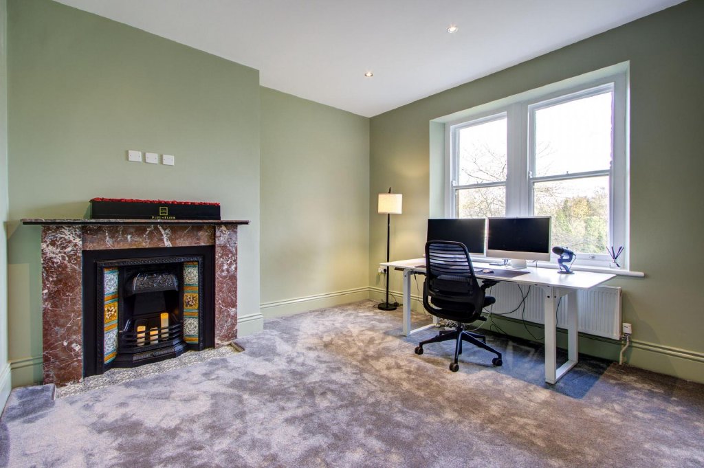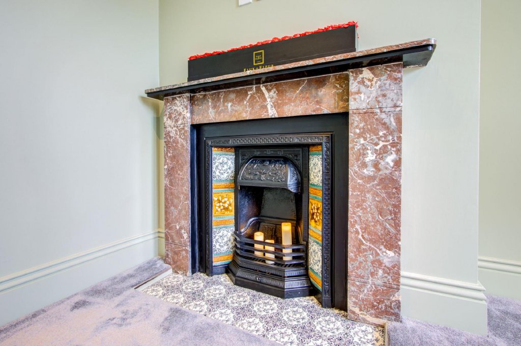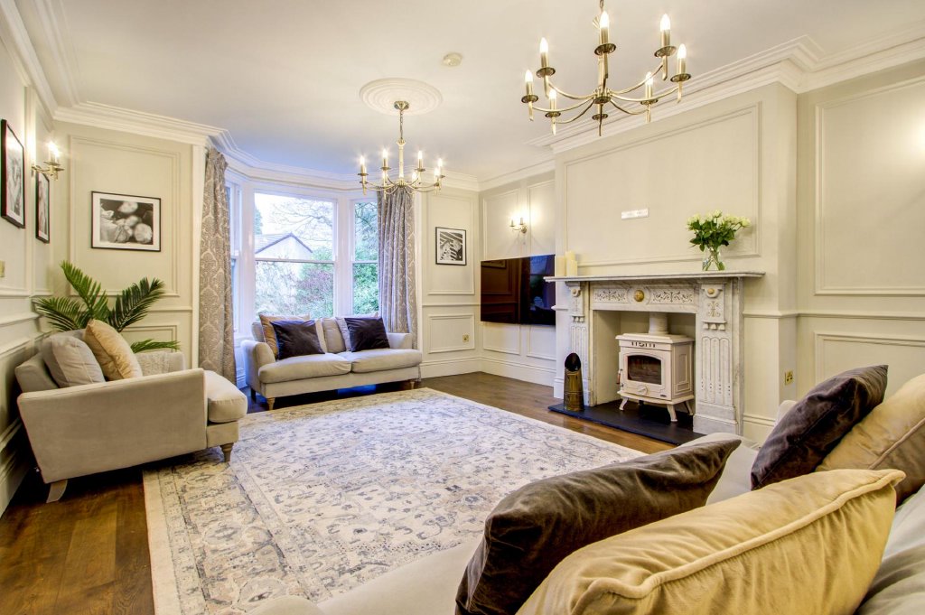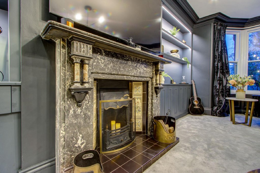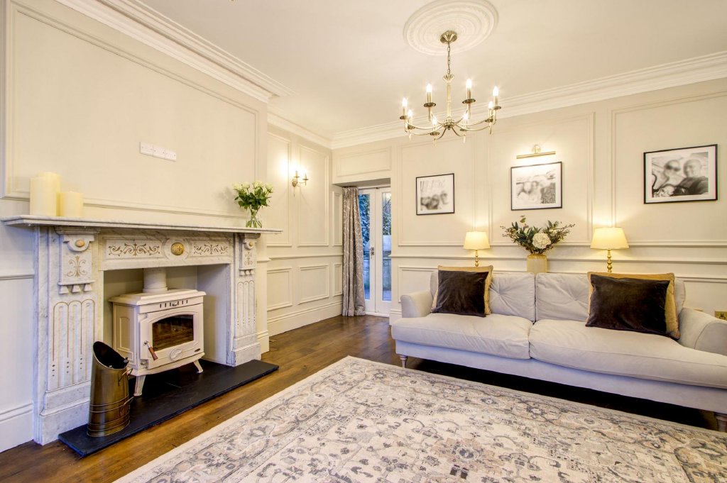 To the front of the home, two beautifully appointed reception rooms with elegant bay windows offer versatile living spaces for every occasion. The living room, with its rich tones and feature working fireplace, provides a cosy retreat on cooler evenings. Next door, the sophisticated drawing room, complete with a charming wood-burning stove and classic period detailing, opens directly onto the rear garden, offering an inviting setting for relaxation or entertaining.