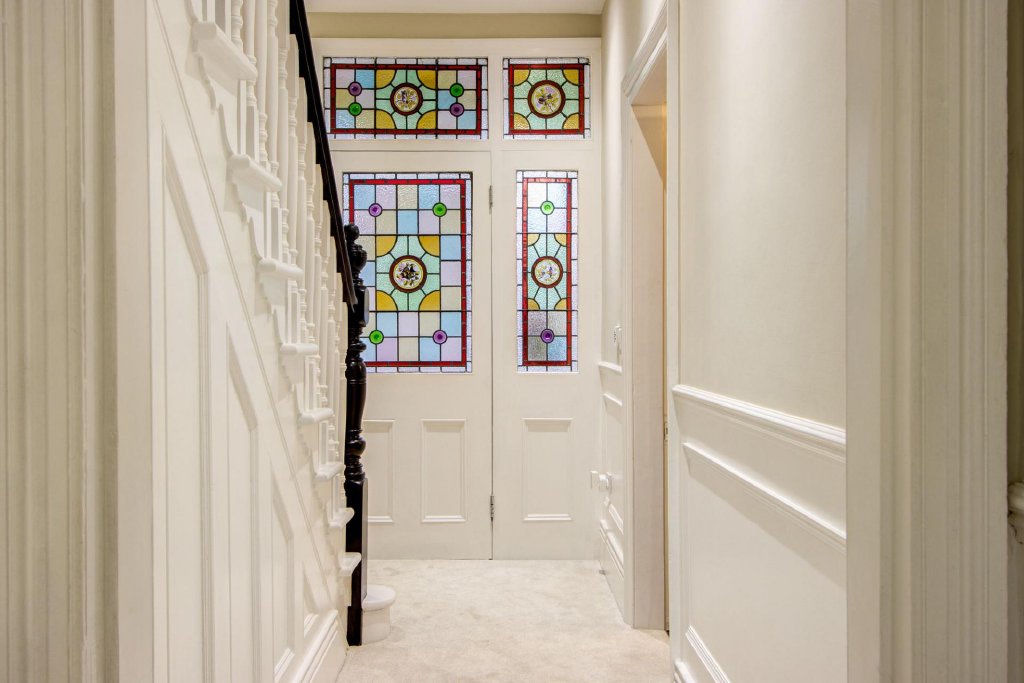 Approached via a private entrance, an expansive driveway provides ample parking for several vehicles. It leads to the side of the property, where a convenient entrance opens directly into the kitchen. At the front, a charming, meandering path guides you to the formal entrance, where a welcoming vestibule awaits. Here, beautiful period tiles and a striking stained-glass window immediately set the tone, showcasing the character and craftsmanship that define this exceptional home.