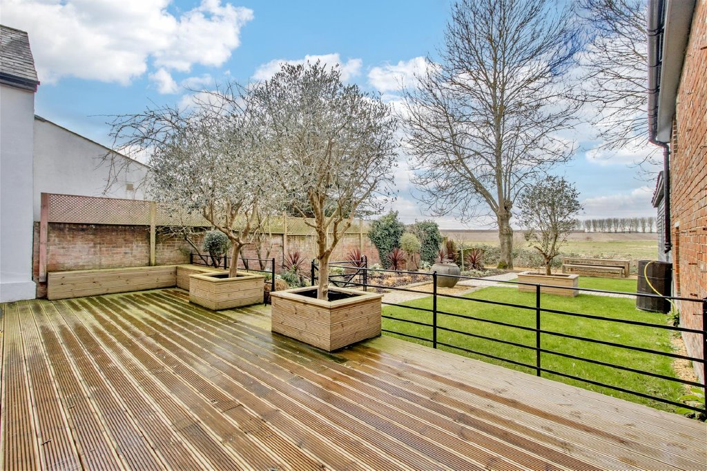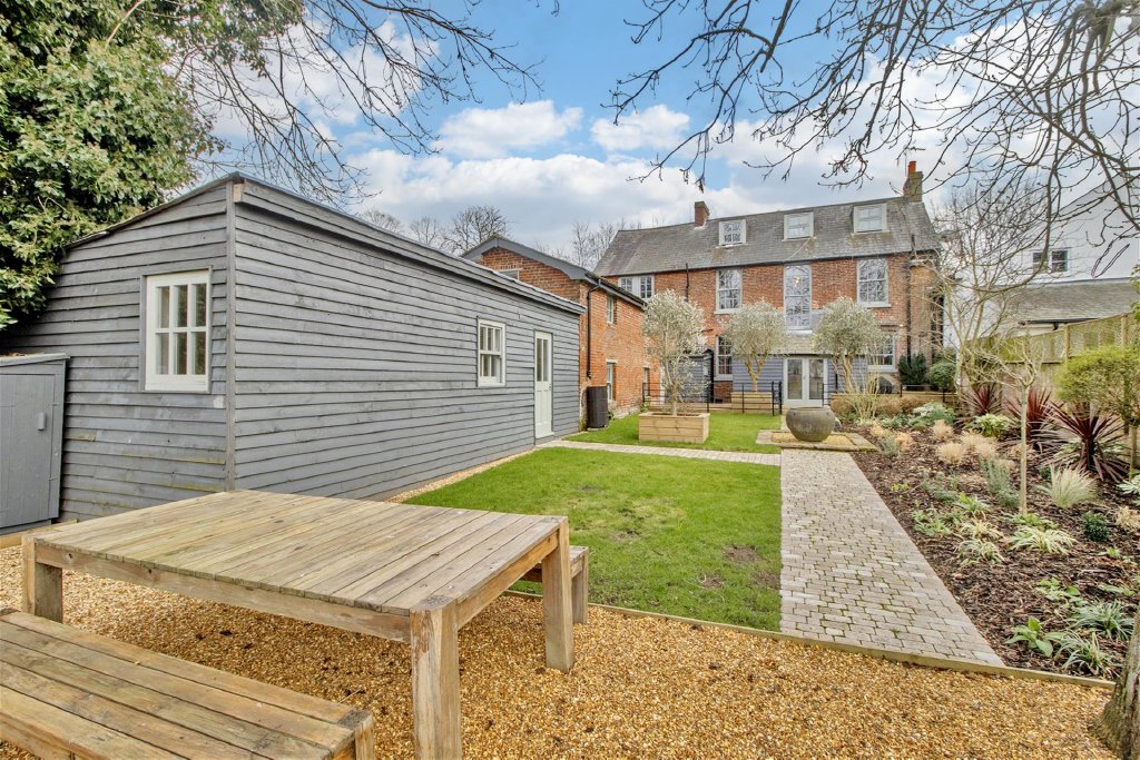 The beautifully landscaped south facing rear garden is a delight with a large decked terrace for outdoor entertaining and a gate flanked by charming olive trees leading to pathways bordered by a lawn and impressive shrub beds, while at the end of the garden is the Wingham river bordered by fields.