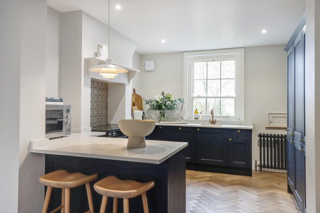 The primary front door opens into an entrance hall with a period staircase to the first floor and access to the versatile ground floor accommodation. This includes an impressive 28ft kitchen and breakfast area and features herringbone oak parquet flooring and a wide central archway creating a delightful open plan feel. Family and friends can sit round a table enjoying a meal in the charming breakfast area with its large bay window and original half height fitted cupboards flanking a lovely open fire with an attractive surround and mantlepiece. While the contemporary kitchen includes an inset range cooker with an induction hob, very smart shaker dark blue style units with marble resin worktops housing an integrated fridge freezer and dishwasher as well as a peninsular breakfast bar and lovely views over the rear garden and the surrounding countryside.