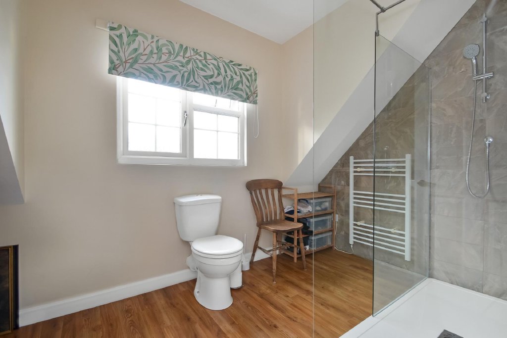 EN-SUITE SHOWER ROOM 11' 0" x 6' 5" (3.35m x 1.96m) Double glazed dormer window to rear aspect, close coupled w.c., wall mounted wash hand basin with mixer tap, mirror and lighting over, wood flooring, shower cubicle with wall mounted taps and drying area to one end, extractor fan.