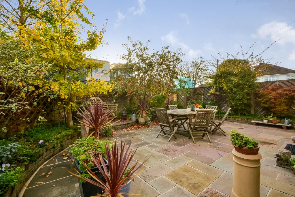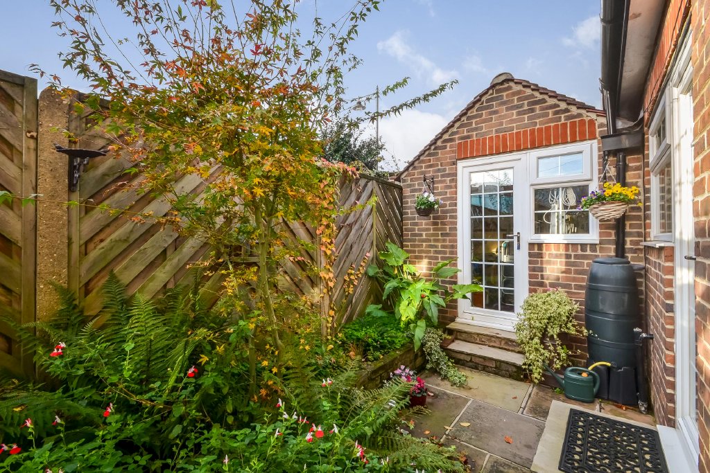 OUTSIDE Pathway from the front of the house wraps round to the side and main front door. To the rear, right hand side is a gateway providing access to the home office, to the rear accessible from the kitchen is an Indian sandstone pathway, wooden built greenhouse and raised flower borders, cold water tap, to the left hand side fronting onto The Thicket is a private garden with high brick curved retaining wall, mature shrubs, evergreens and bushes, Indian sandstone patio with gated entrance providing access to main front door and sitting room.