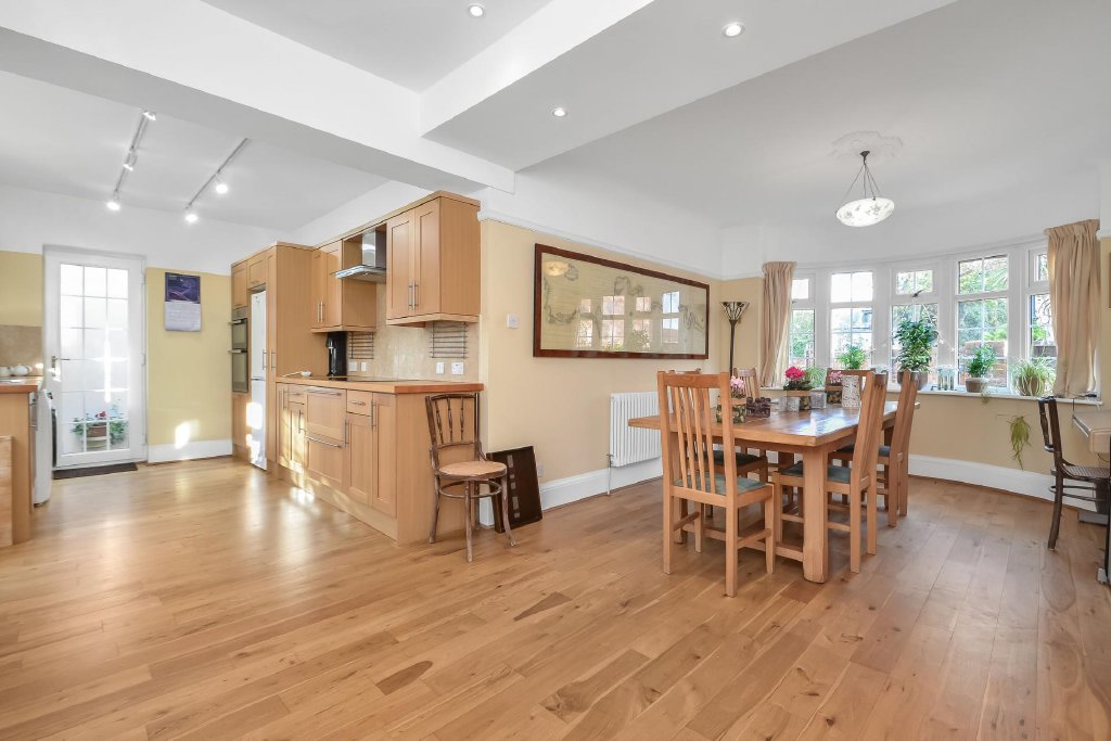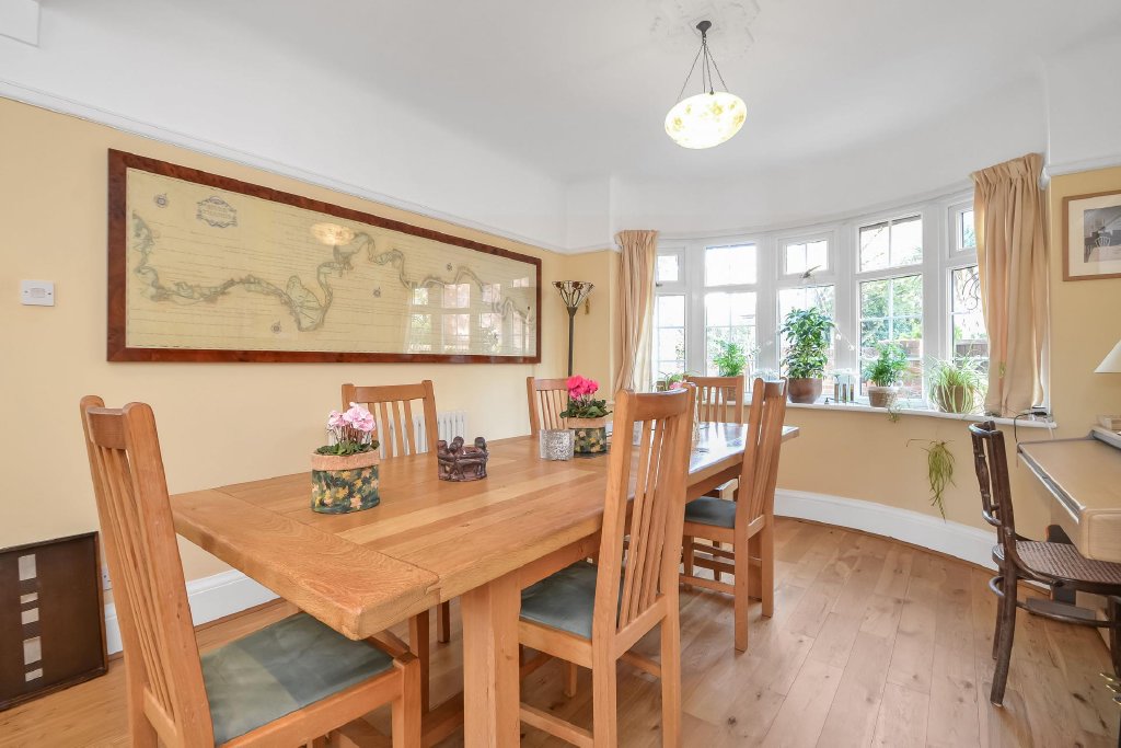 DINING ROOM 19' 10" into bay window x 11' 0" (6.05m x 3.35m) L shaped, opening at right angles into the kitchen, double glazed bay window to front aspect overlooking driveway, engineered oak flooring, roll top radiator, infinity ceiling, picture rail, double glazed window to rear aspect, wall mounted cabinet with glazed doors and shelving, ceiling spotlights.