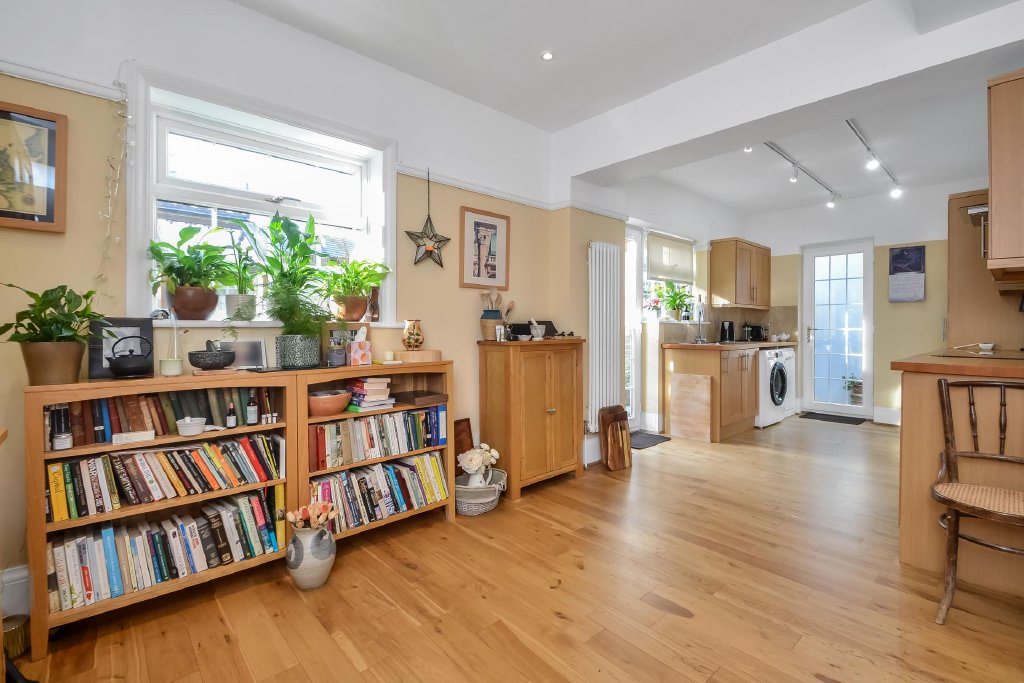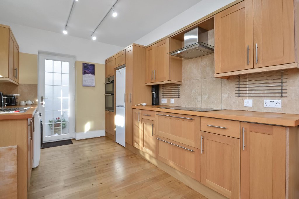 KITCHEN 12' 9" x 8' 10" (3.89m x 2.69m) Overall width 23'9" x 8'10" opening into dining room. Comprehensive range of matching soft close wall and floor units with wood block surface, inset Bosch induction hob with extractor hood, fan and light over, ceramic tiled surrounds, range of pan drawers, space for free standing fridge/freezer with tall larder cupboard to one side housing Zanussi double oven and grill to the other with storage cupboards over and under, matching flooring, inset 1½ bowl stainless steel sink unit with mixer tap, washing machine point, space for dishwasher, double glazed door leading to rear courtyard providing access to the home office, double glazed door with window to one side leading to rear garden, tall roll top contemporary style radiator, ceiling spotlights.