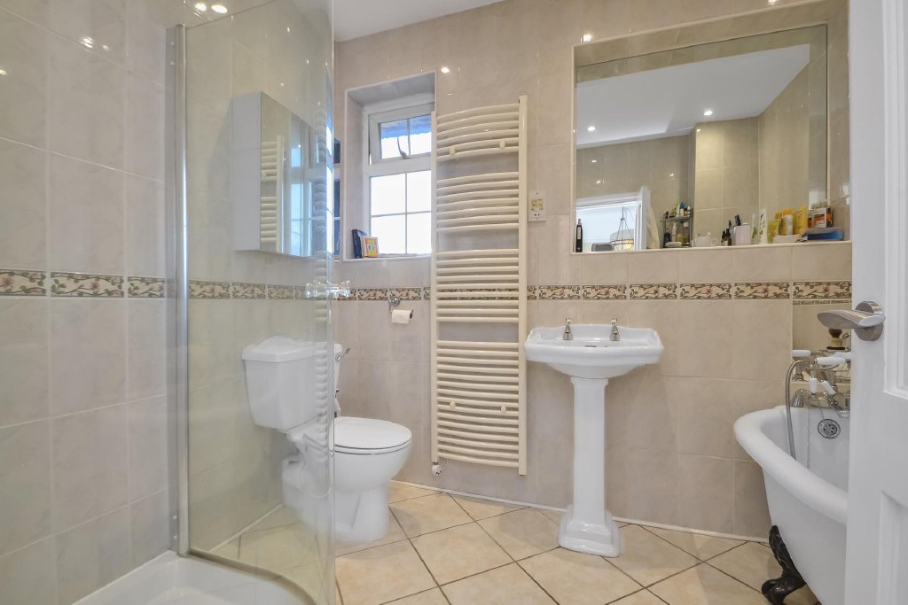 FEATURE BATHROOM White suite comprising: free standing claw footed bath with raised end, telephone style mixer tap with shower attachment, fully ceramic tiled to floor and walls, underfloor heating, large mirror, pedestal wash hand basin, heated towel rail, close coupled w.c., double glazed frosted window, mirror fronted medicine cabinet, corner shower cubicle with wall mounted controls, ceiling spotlights.