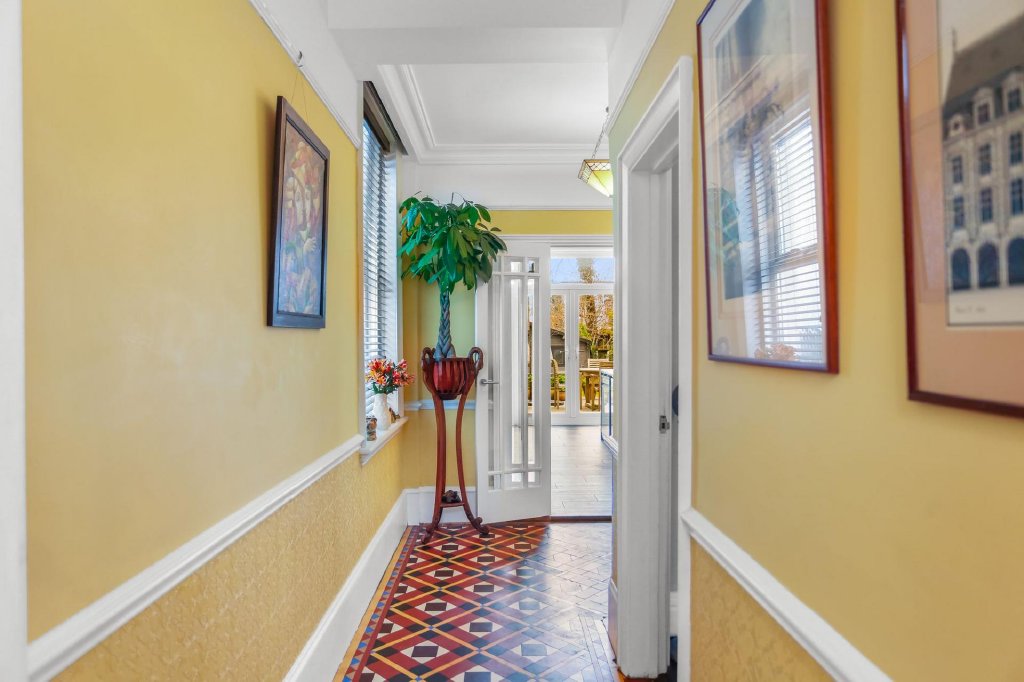 To the front of the property, a bay windowed living room is crowned by ornate plaster panel mouldings, creating an inviting family sanctuary. Additional period gems are the featured patterned glass windows with intricate geometric design adding a warm glow to the space.