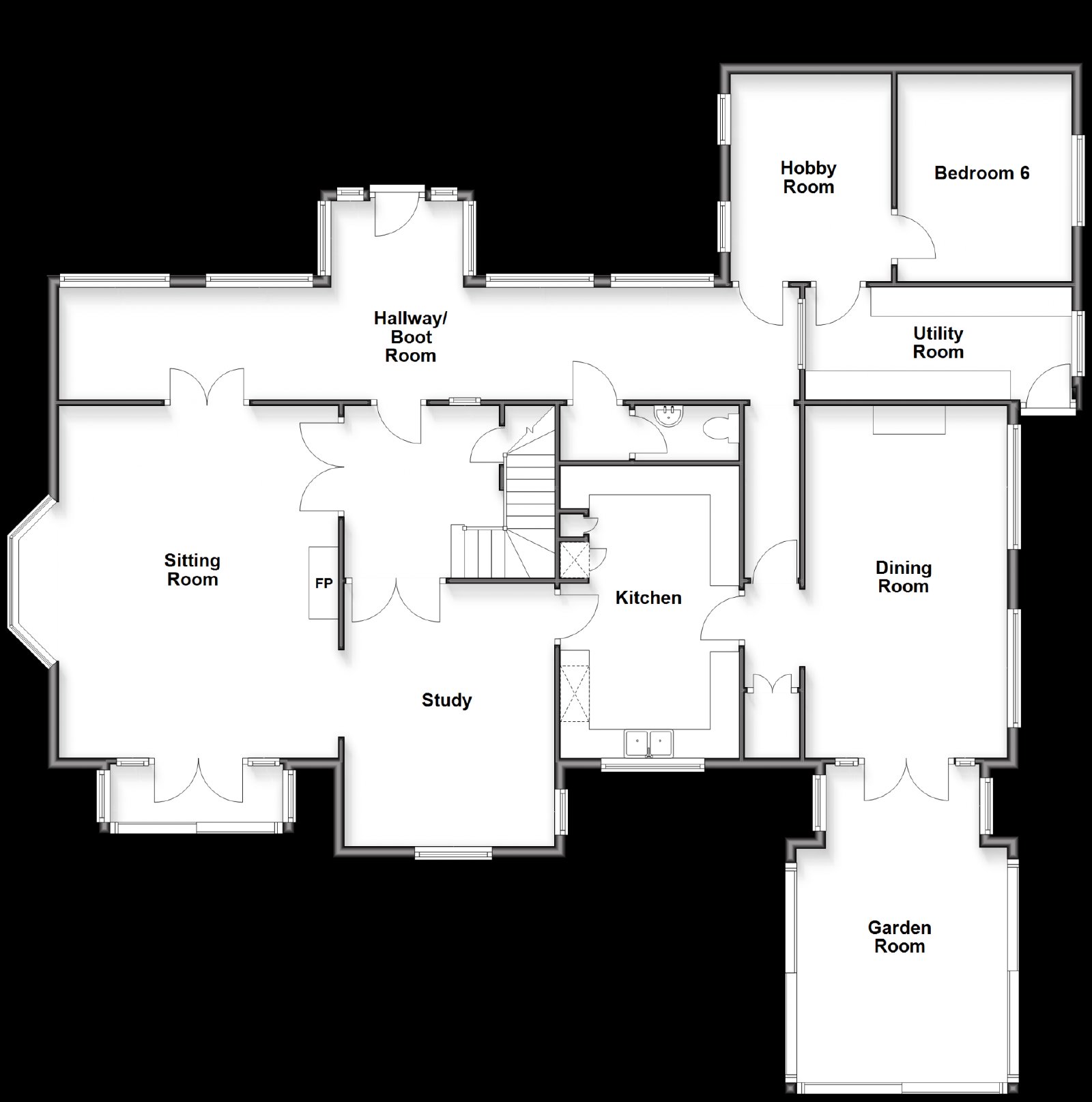 The kitchen has been recently refitted with shaker-style cabinetry, quartz worktops, quality appliances, and views across the grounds. It flows seamlessly into the elegant dining room, where oak flooring, a feature fireplace, and picture windows create a warm, sociable space suited to both everyday meals and formal entertaining. One of the home’s standout features is the architect-designed garden room, a contemporary, light-filled addition with sliding glass walls, a living roof, and underfloor heating. This exceptional space immerses occupants in panoramic scenery and opens directly to the garden terrace.