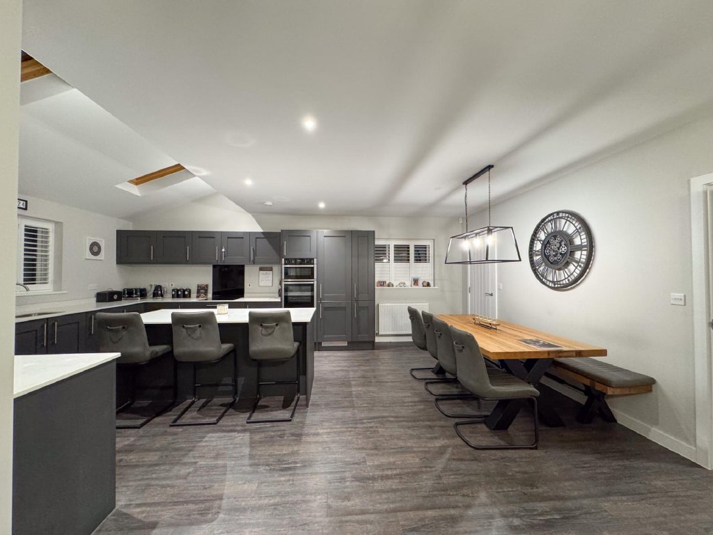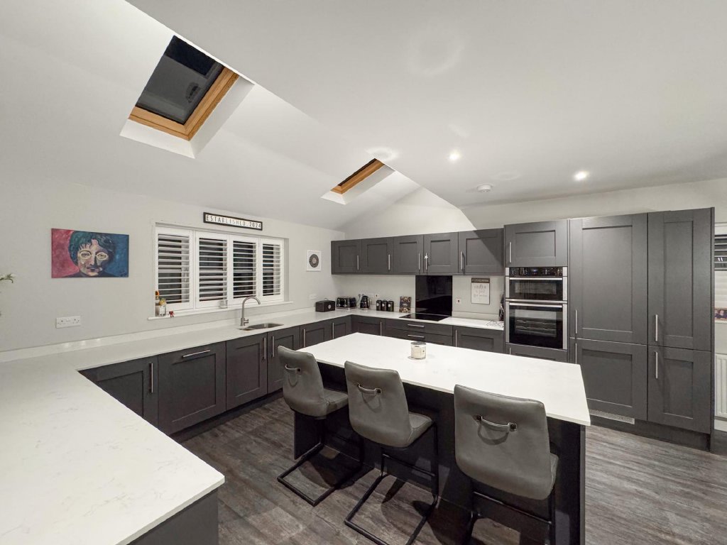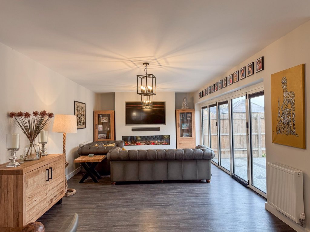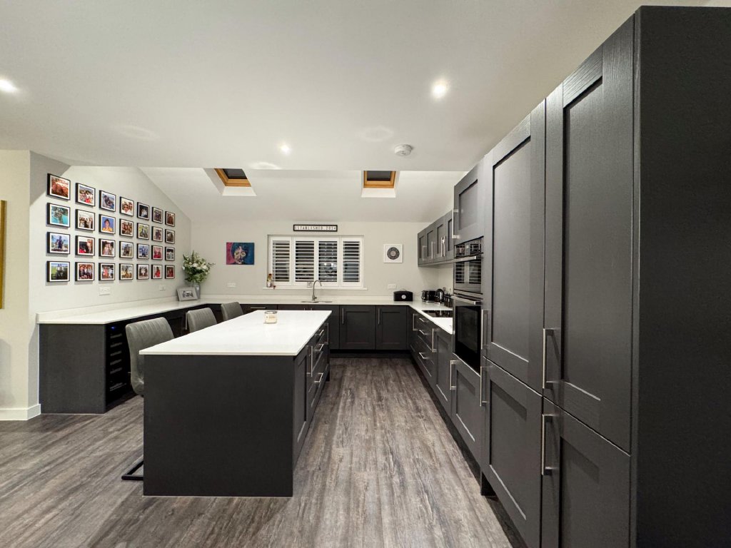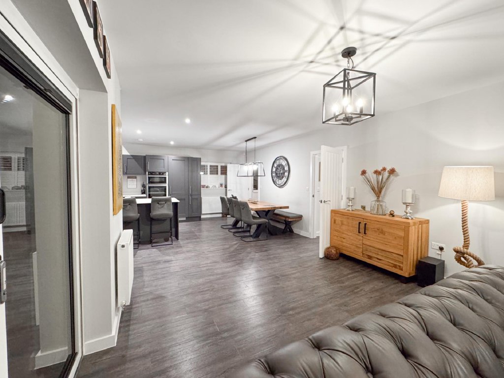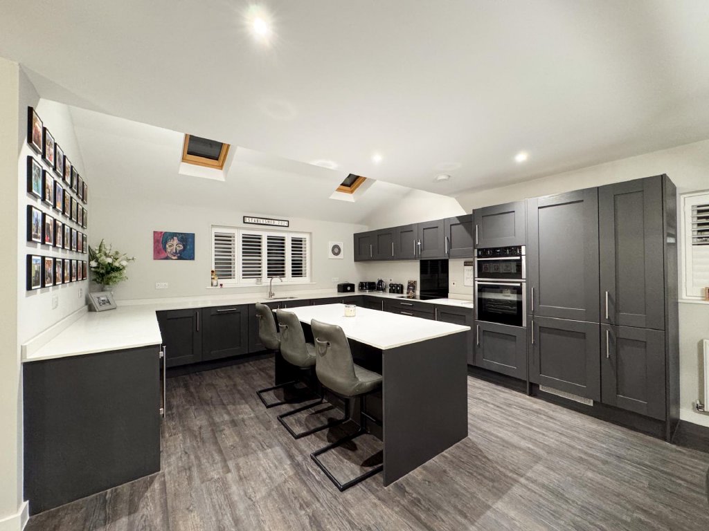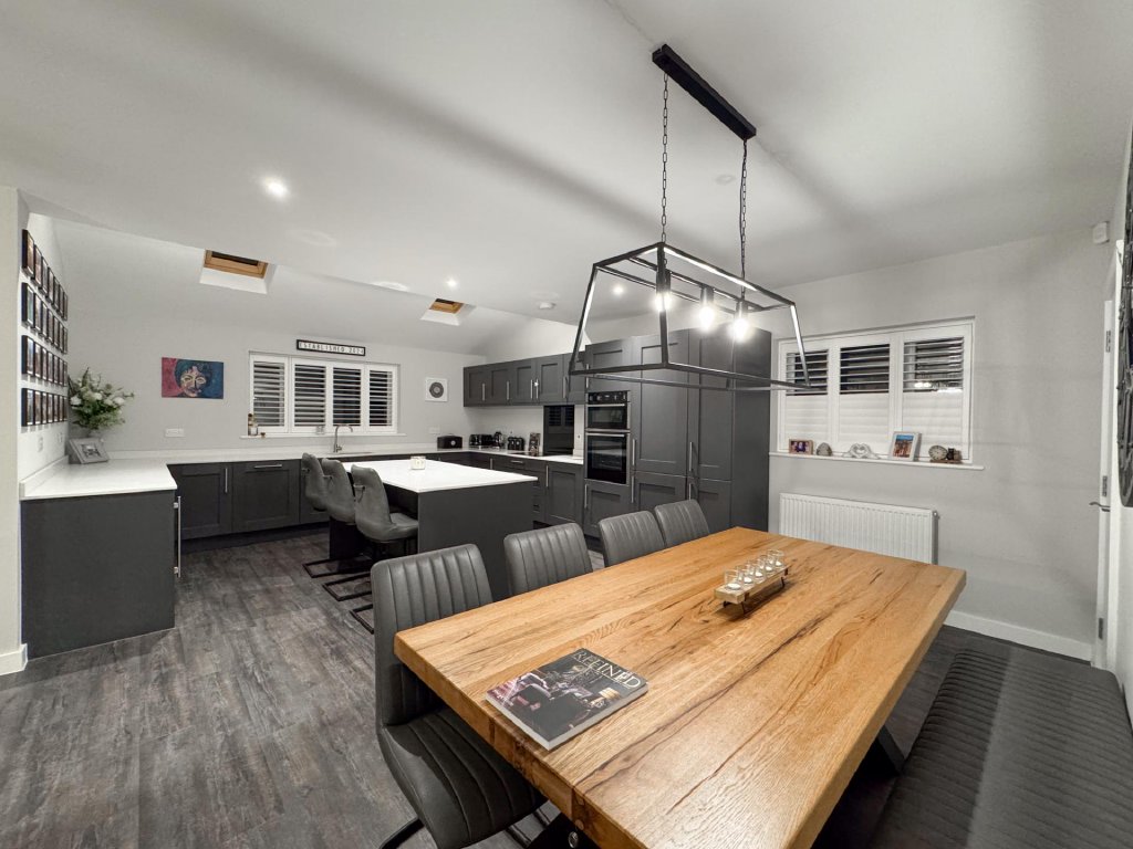 To the rear of the property lies a truly stunning open-plan kitchen, dining and family area, spanning the entire width of the home and creating a superb social hub ideal for modern living. The kitchen is designed to a high specification, featuring vaulted windows in the ceiling that flood the space with natural light, and premium appliances including a wine cooler, dishwasher, fridge freezer, hob and extractor. With seamless garden access and ample space for entertaining, this expansive open-plan area serves as the heart of the home.
