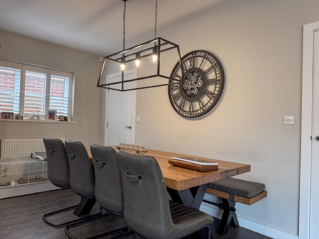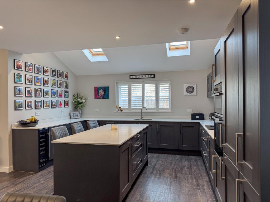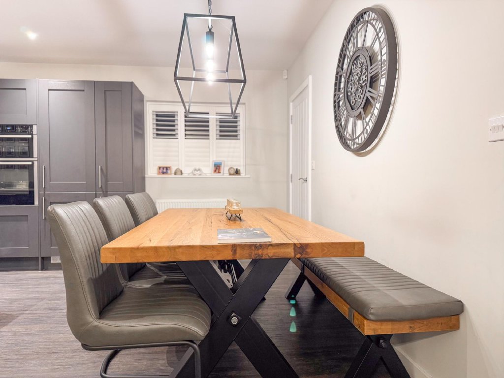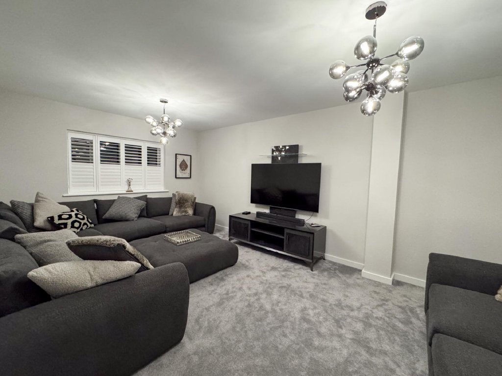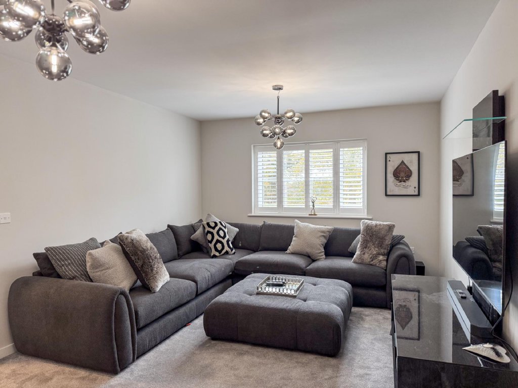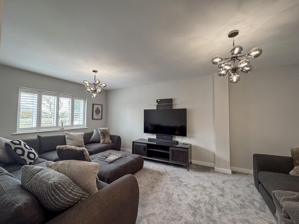 To the rear of the property lies a truly stunning open-plan kitchen, dining and family area, spanning the entire width of the home and creating a superb social hub ideal for modern living. The kitchen is designed to a high specification, featuring vaulted windows in the ceiling that flood the space with natural light, and premium appliances including a wine cooler, dishwasher, fridge freezer, hob and extractor. With seamless garden access and ample space for entertaining, this expansive open-plan area serves as the heart of the home.