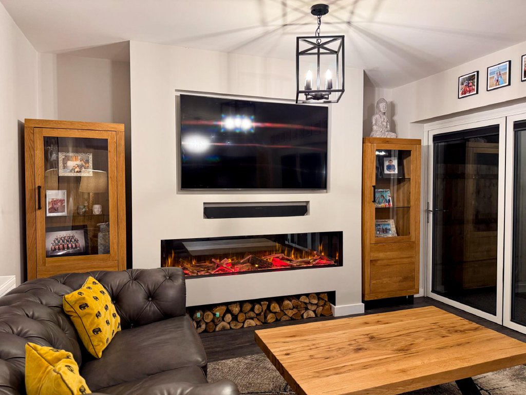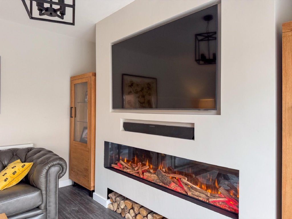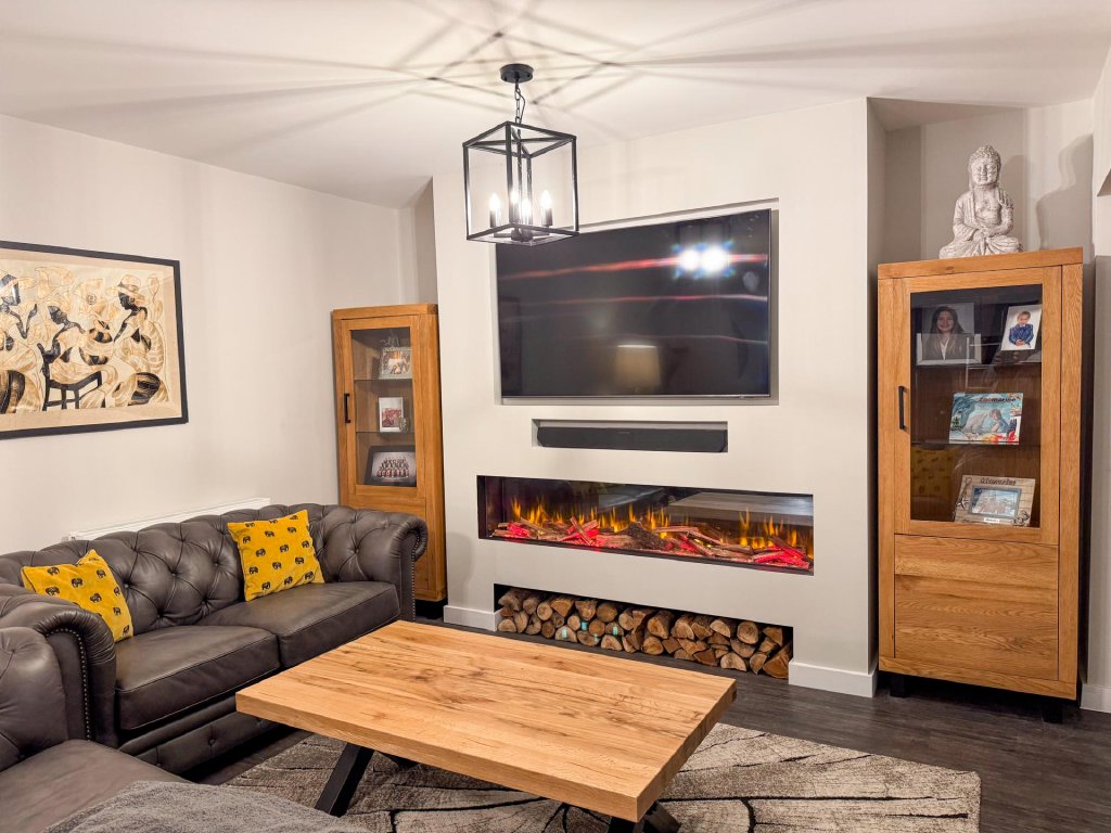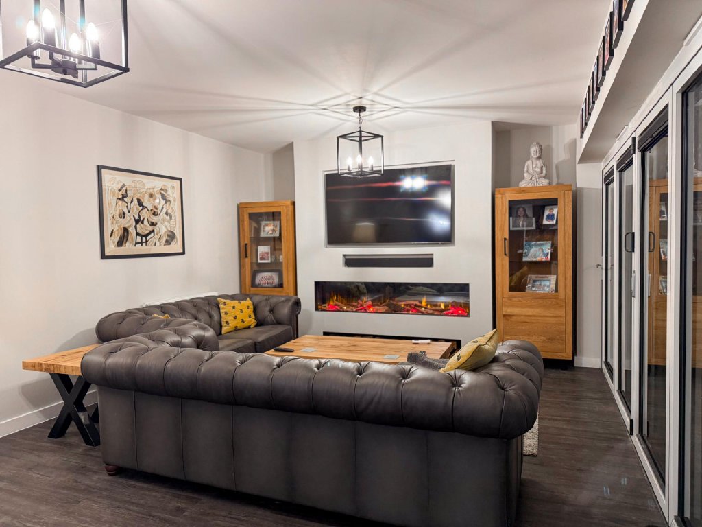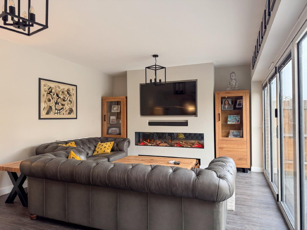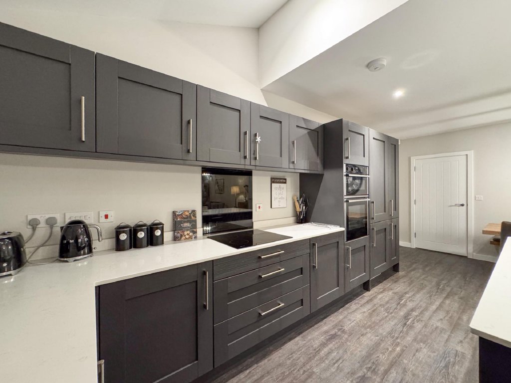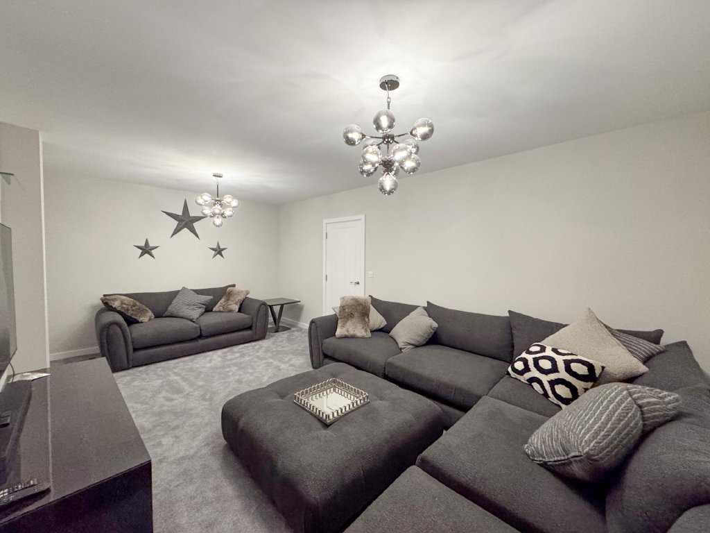 To the rear of the property lies a truly stunning open-plan kitchen, dining and family area, spanning the entire width of the home and creating a superb social hub ideal for modern living. The kitchen is designed to a high specification, featuring vaulted windows in the ceiling that flood the space with natural light, and premium appliances including a wine cooler, dishwasher, fridge freezer, hob and extractor. With seamless garden access and ample space for entertaining, this expansive open-plan area serves as the heart of the home.