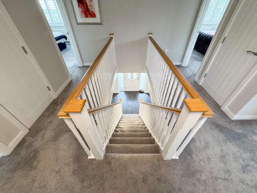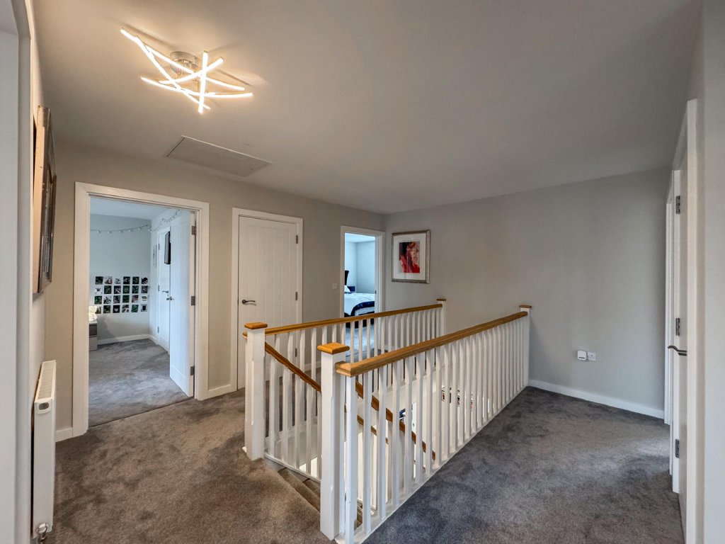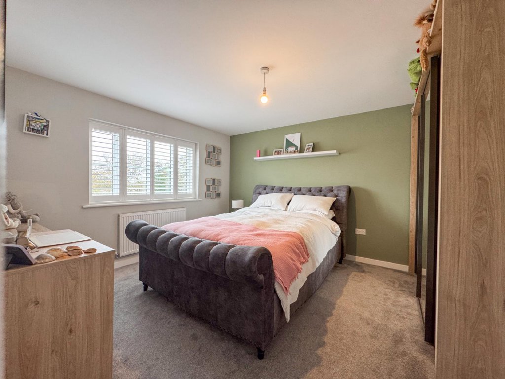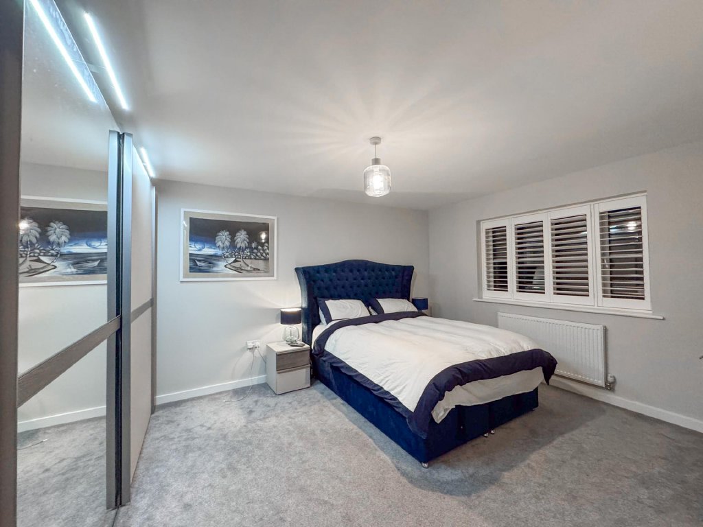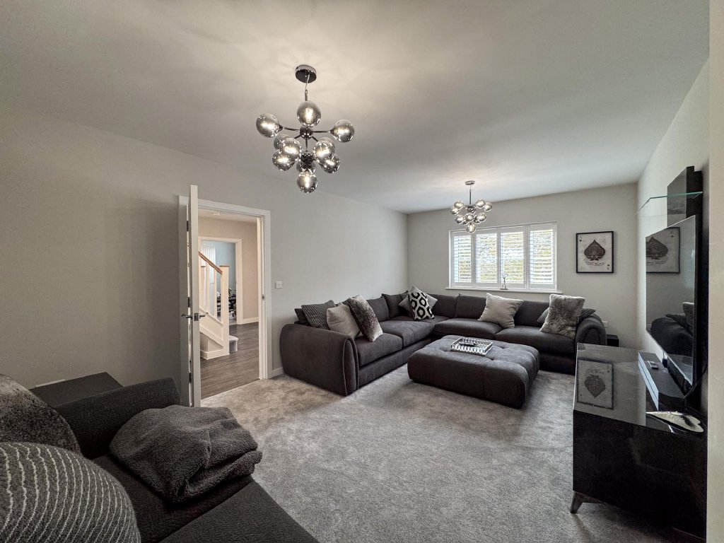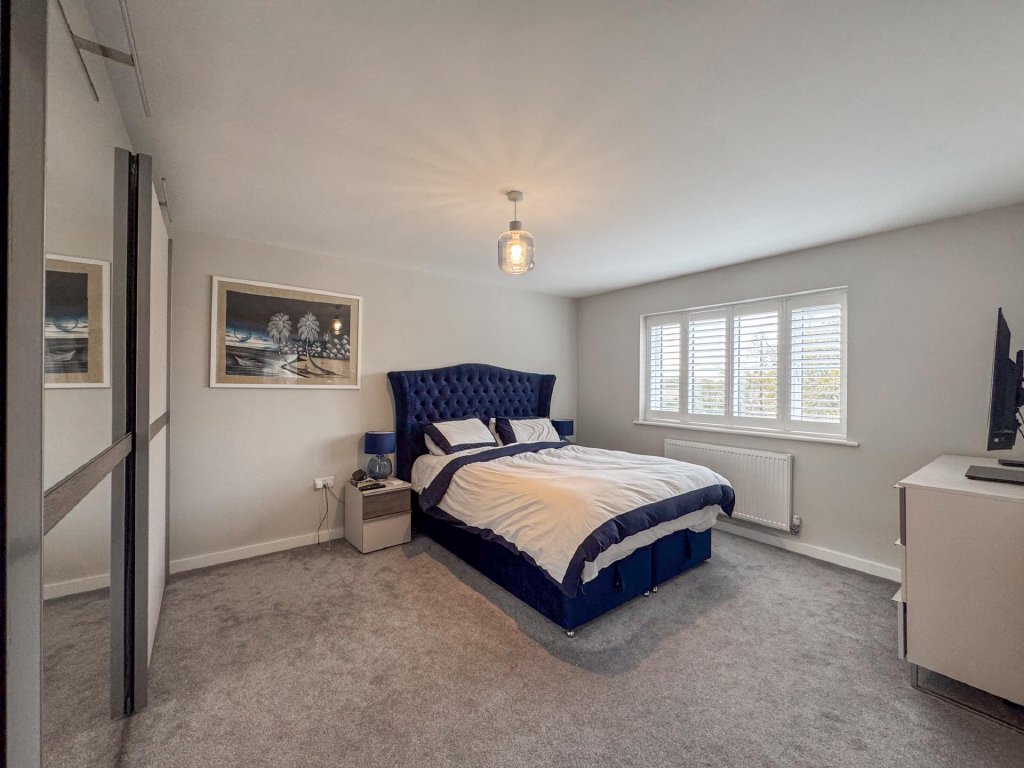 Upstairs, the property boasts five generously sized bedrooms, all accessed from a spacious central landing. The principal bedroom features its own private en-suite, while a second bedroom also benefits from an en-suite, providing excellent flexibility for family or guests. A contemporary family bathroom serves the remaining bedrooms. The property benefits from fitted shutters to all windows, which will remain in situ.