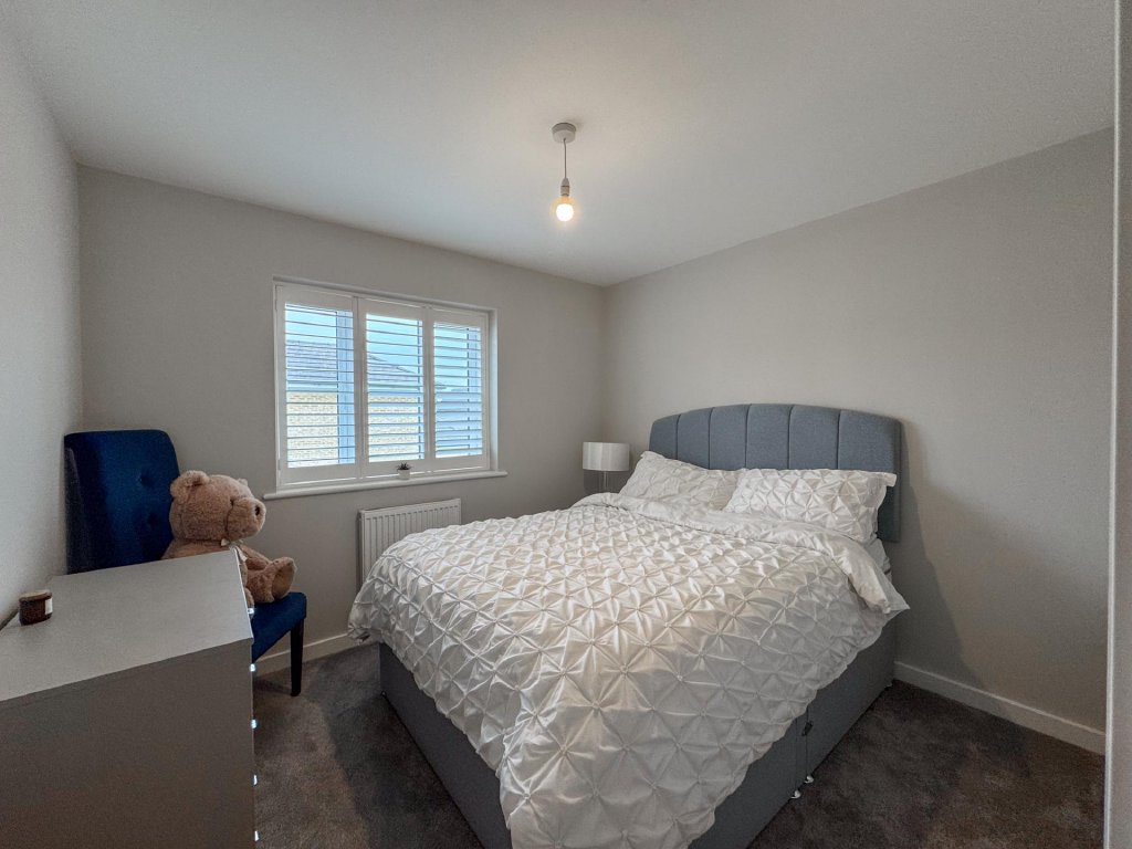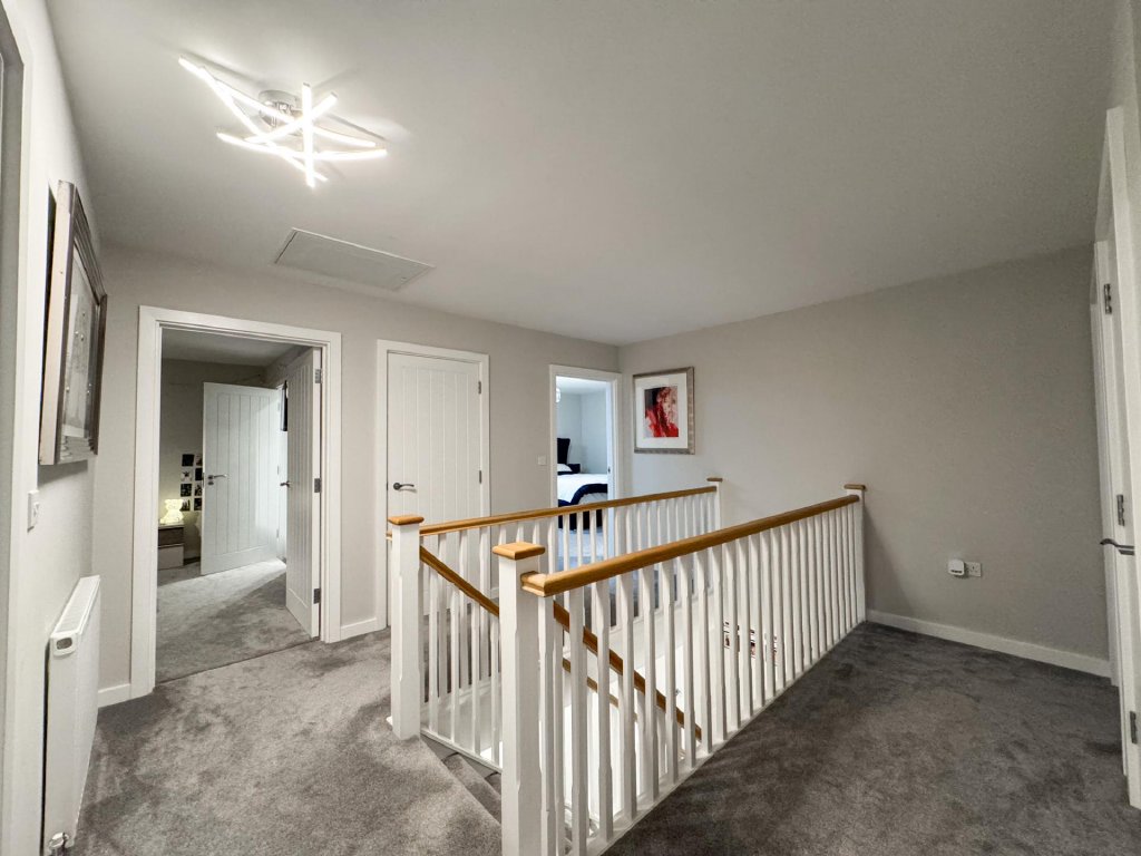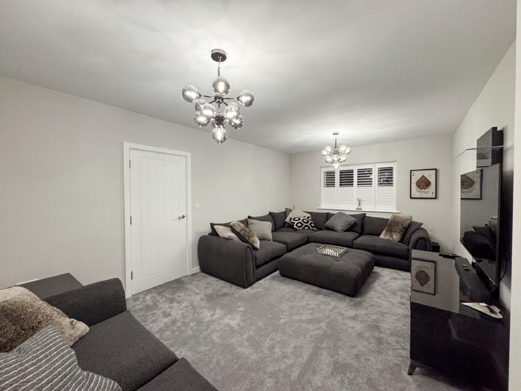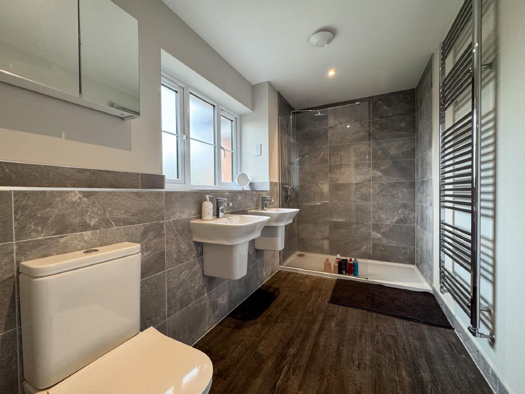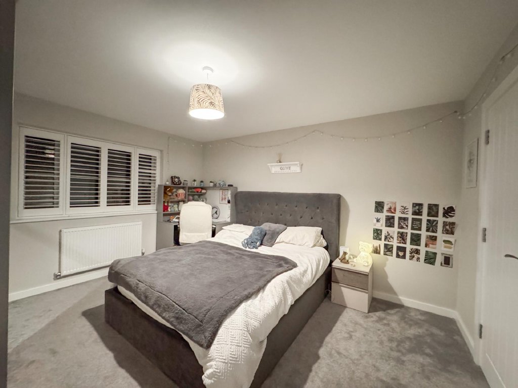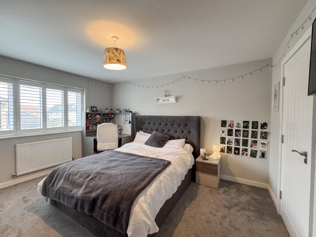 Upstairs, the property boasts five generously sized bedrooms, all accessed from a spacious central landing. The principal bedroom features its own private en-suite, while a second bedroom also benefits from an en-suite, providing excellent flexibility for family or guests. A contemporary family bathroom serves the remaining bedrooms. The property benefits from fitted shutters to all windows, which will remain in situ.