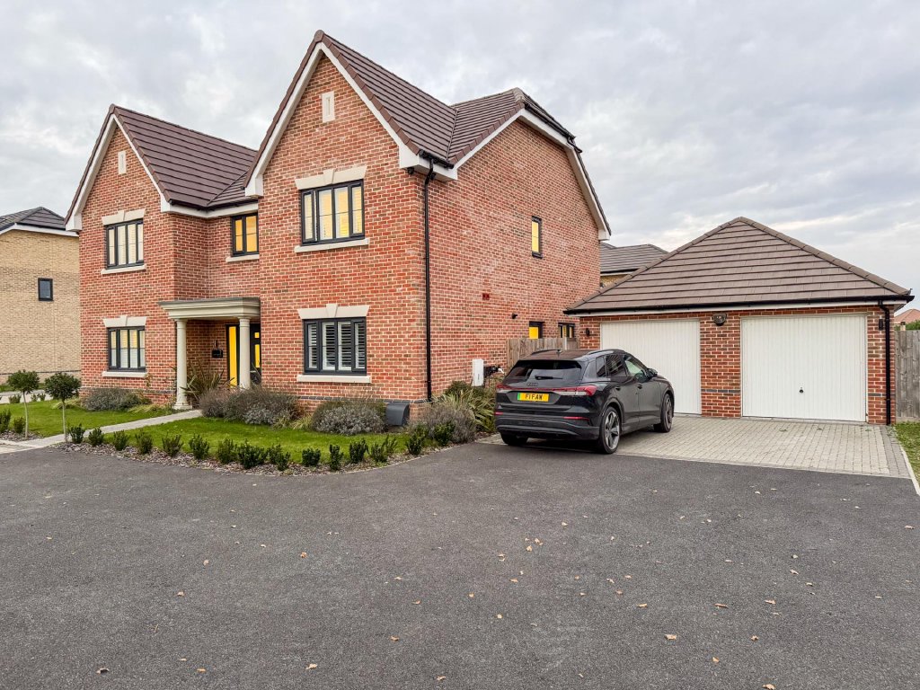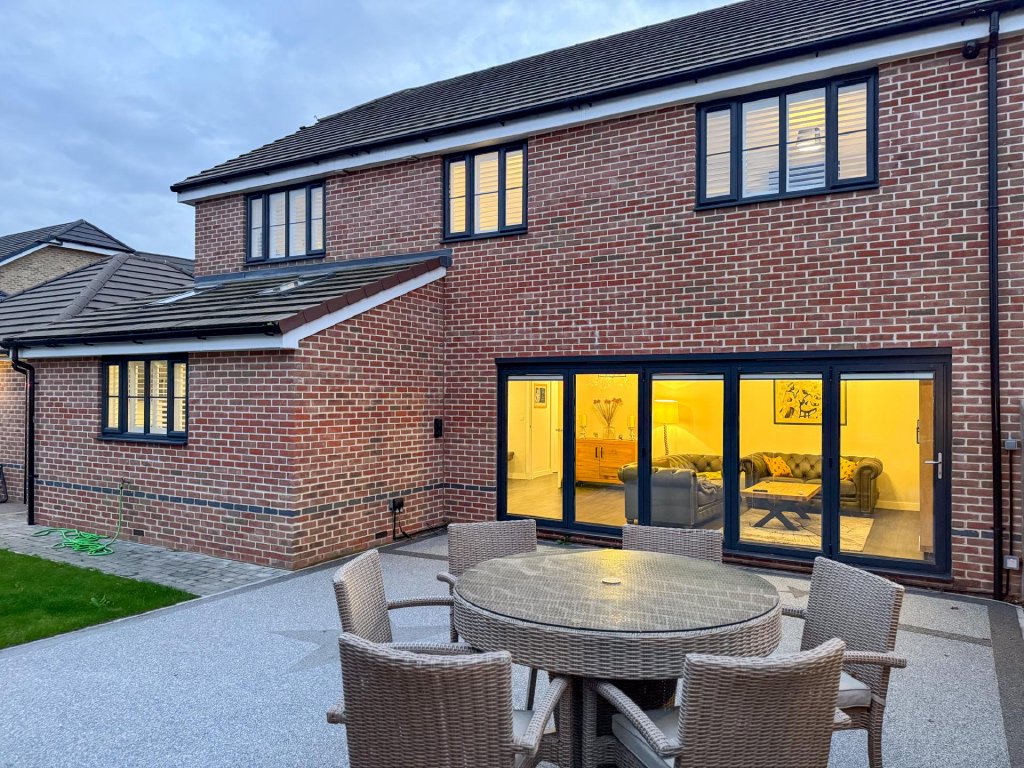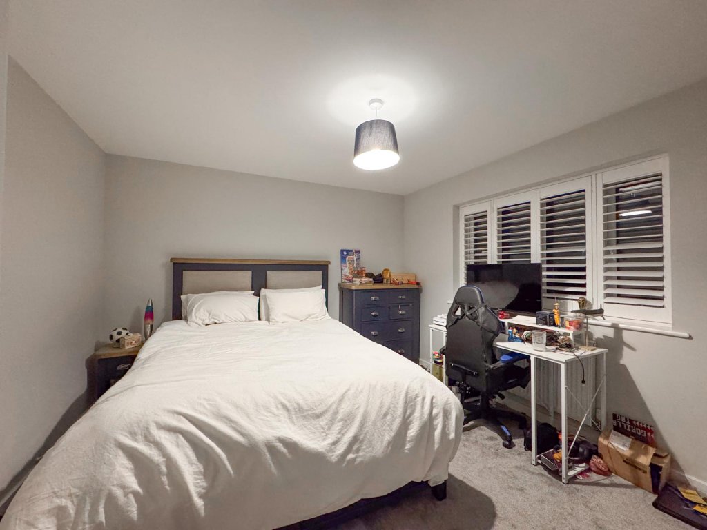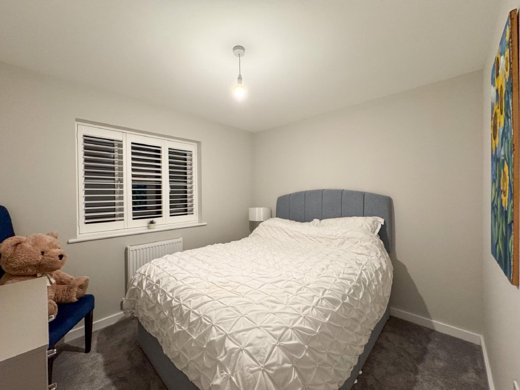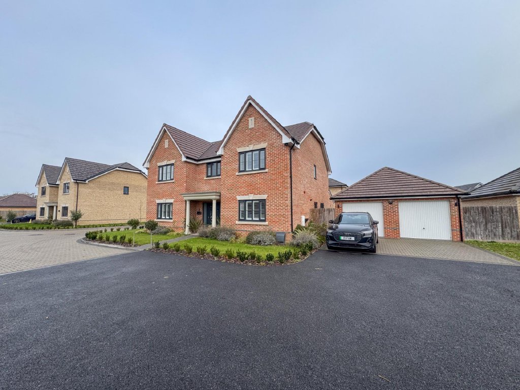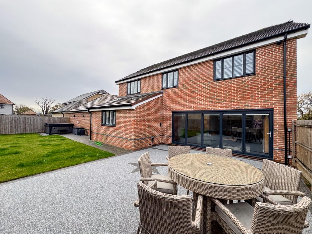 Upstairs, the property boasts five generously sized bedrooms, all accessed from a spacious central landing. The principal bedroom features its own private en-suite, while a second bedroom also benefits from an en-suite, providing excellent flexibility for family or guests. A contemporary family bathroom serves the remaining bedrooms. The property benefits from fitted shutters to all windows, which will remain in situ.