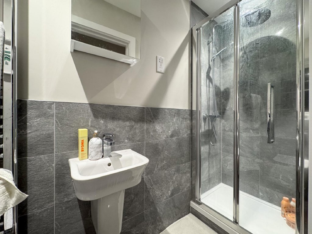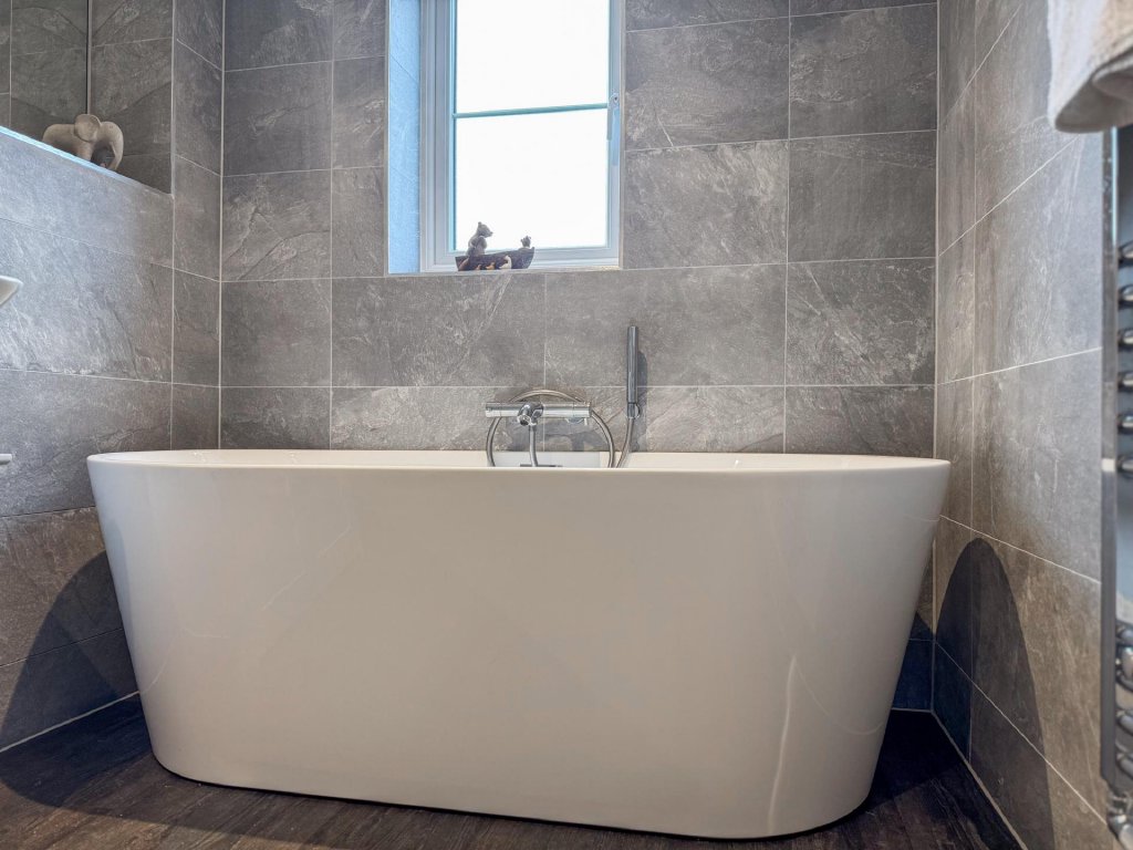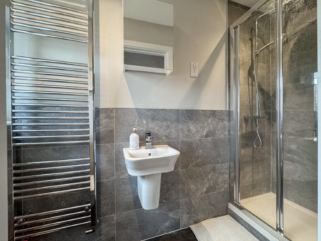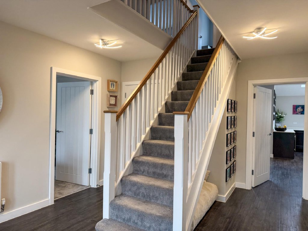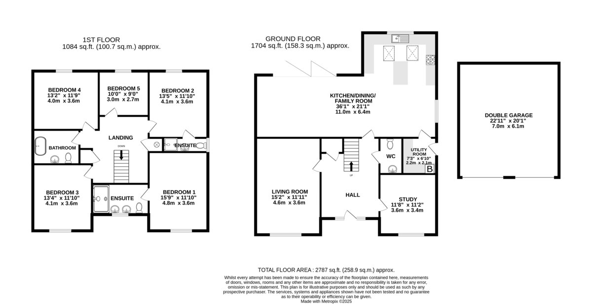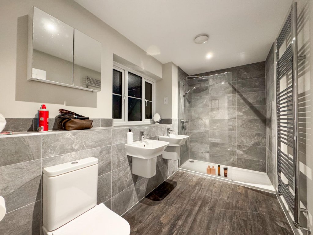 Upstairs, the property boasts five generously sized bedrooms, all accessed from a spacious central landing. The principal bedroom features its own private en-suite, while a second bedroom also benefits from an en-suite, providing excellent flexibility for family or guests. A contemporary family bathroom serves the remaining bedrooms. The property benefits from fitted shutters to all windows, which will remain in situ.