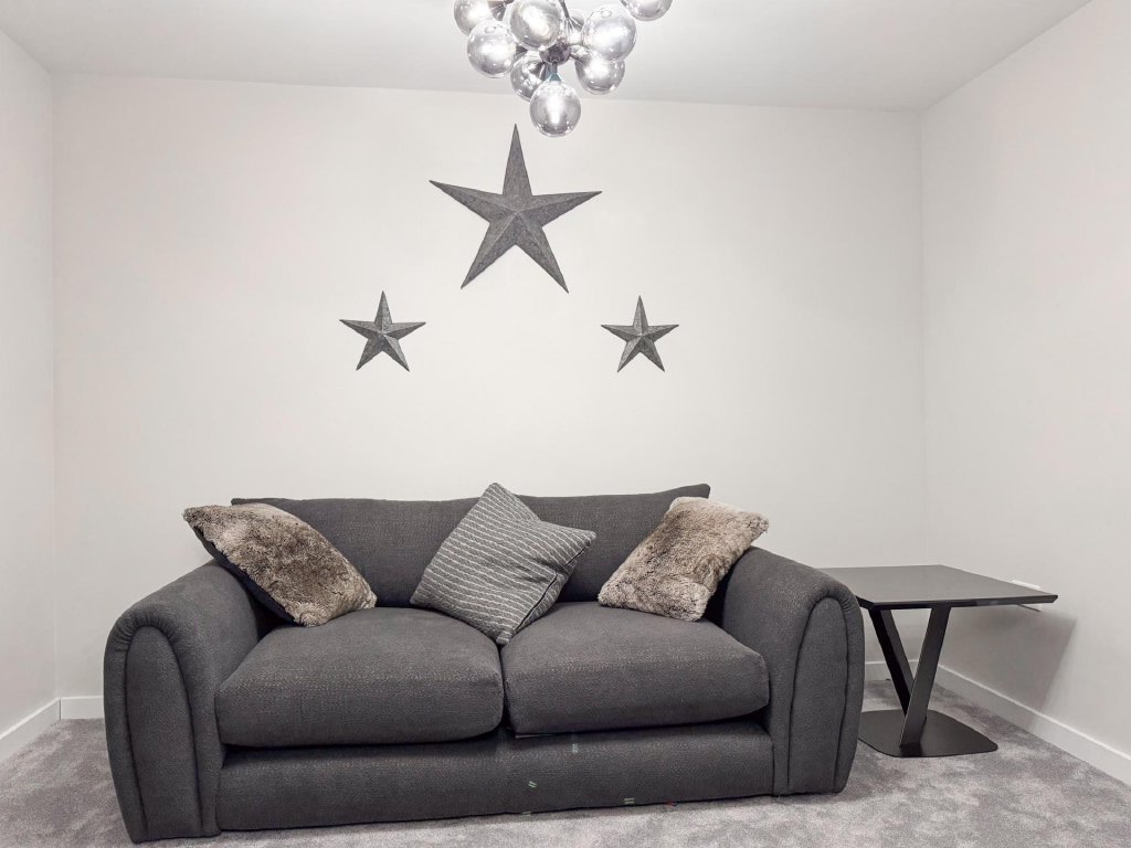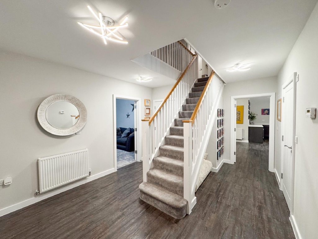 STEP INSIDE The welcoming entrance hall provides access to the main reception spaces, setting the tone for this impressive home. The light and airy living room offers a bright and inviting environment, perfect for relaxation.