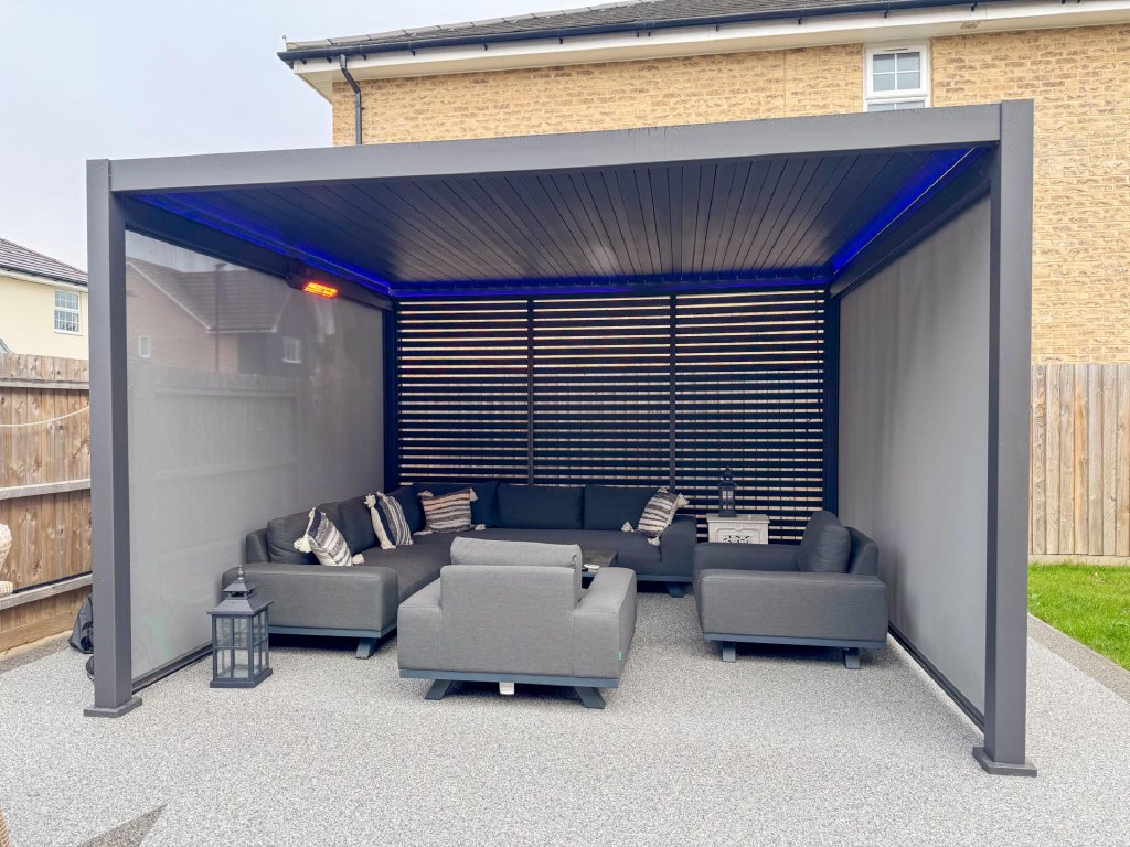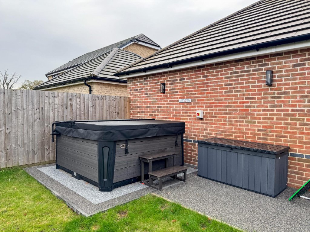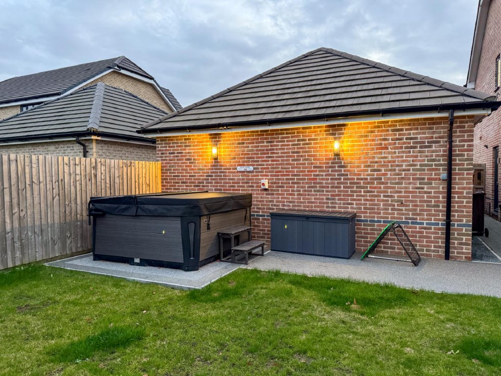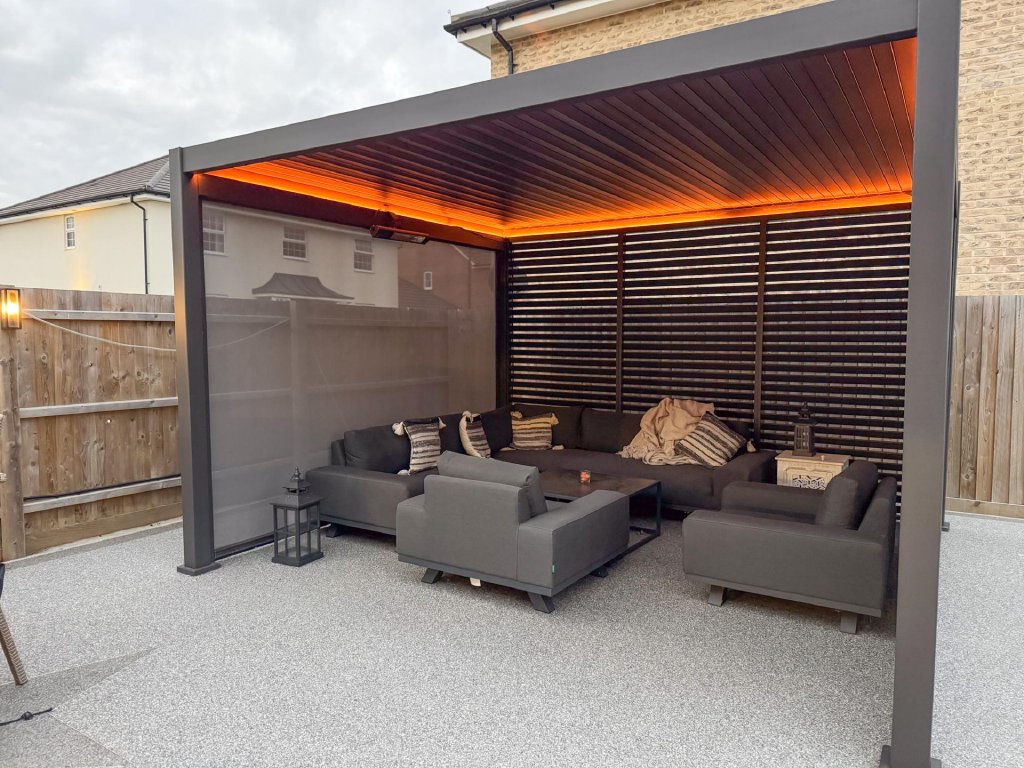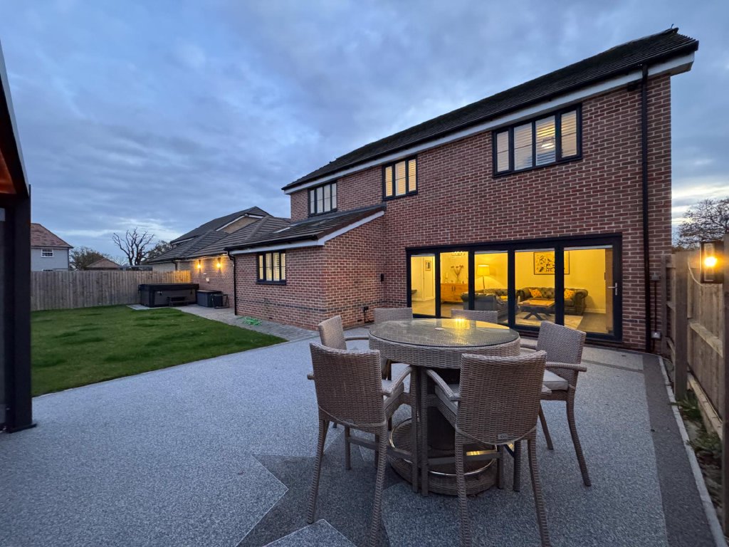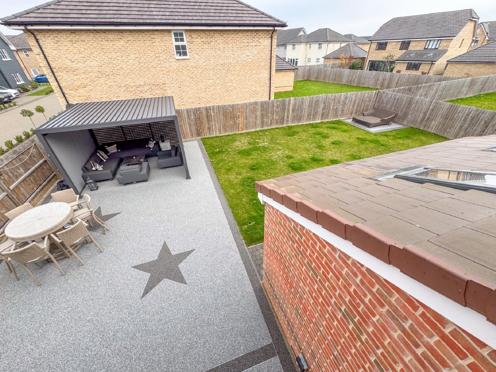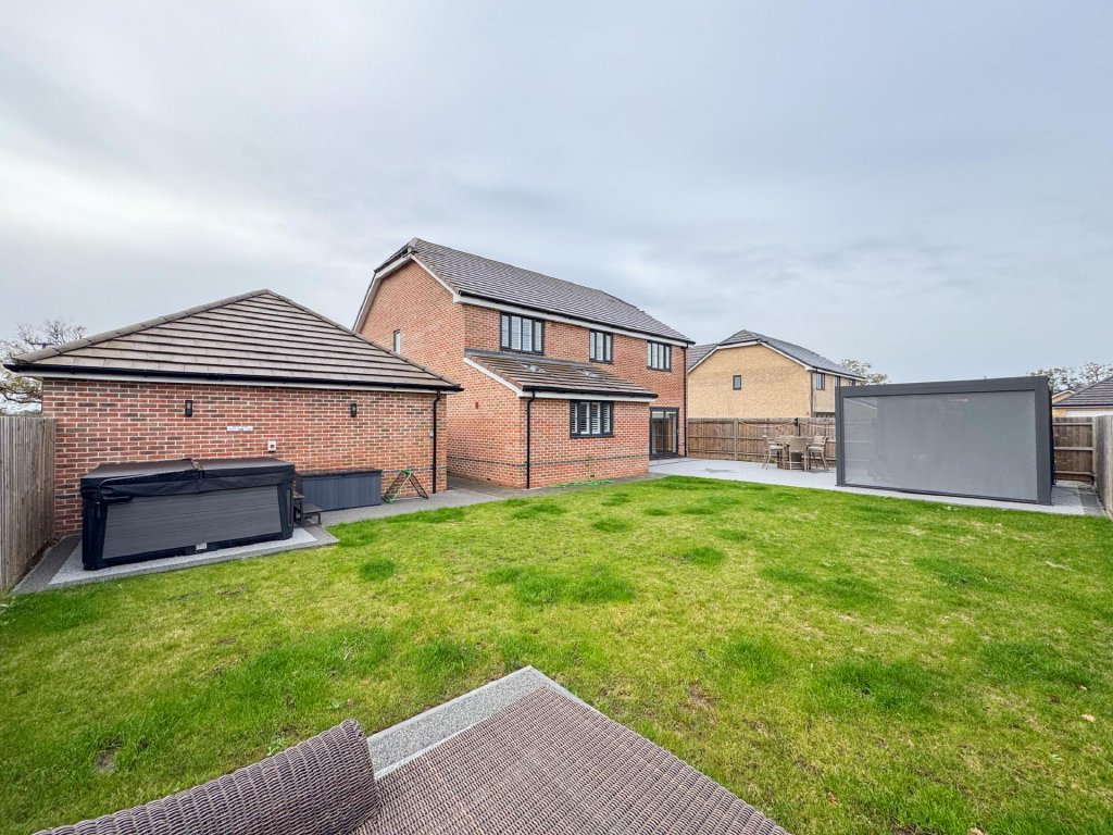 STEP OUTSIDE The rear garden is a private and enclosed space, thoughtfully designed for both relaxation and entertaining. A generous lawn provides a lush backdrop, while a large patio area, complemented by a heated pergola, making it ideal for year-round use is accessed directly from the impressive kitchen/dining/family room, creates the perfect setting for alfresco dining and seamless indoor-outdoor living. At the far end of the garden, a second, separate patio area offers an additional spot to unwind or enjoy the evening sun.