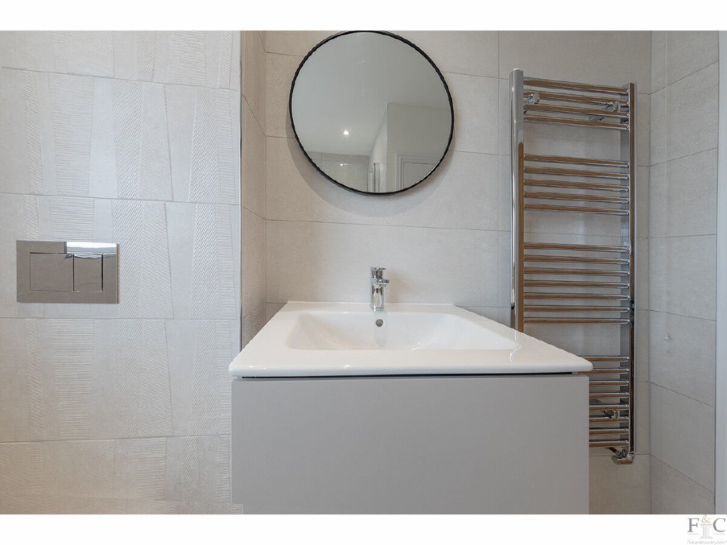 Three double bedrooms are arranged on the ground floor, ideal for multi-generational living or flexible use as home offices or playrooms. Two have fitted wardrobes, and all are served by a beautifully appointed family bathroom with Duravit sanitaryware, bath with shower over, WC and vanity basin.