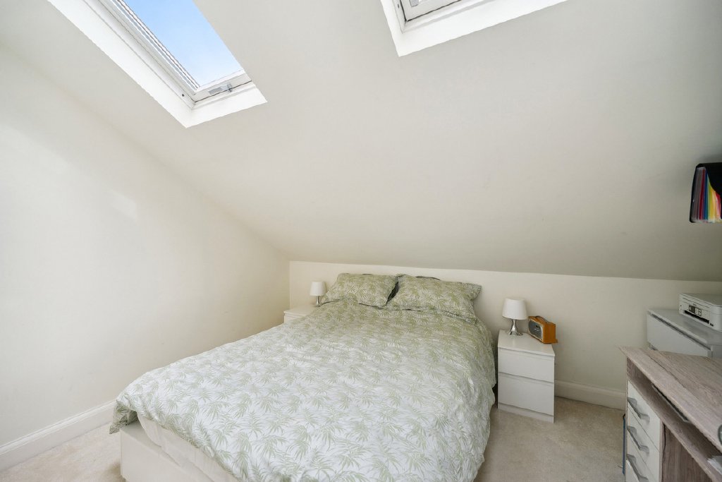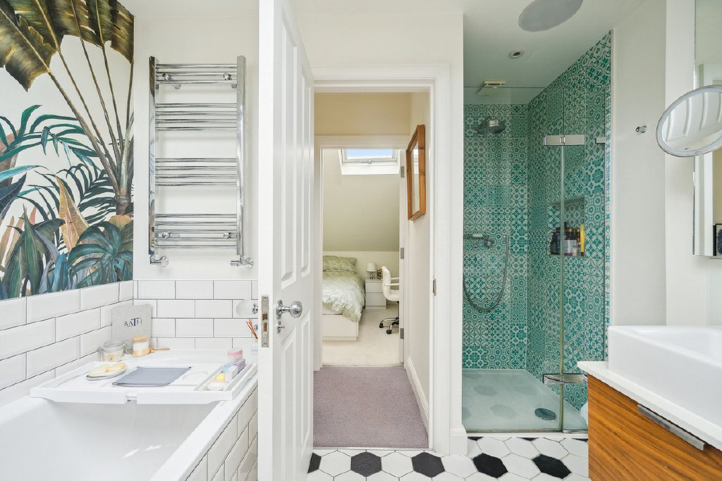 The first floor hosts two generously sized double bedrooms, while the top floor has been converted to include a double bedroom and a modern family bathroom, complete with both a bathtub and a separate glass shower.