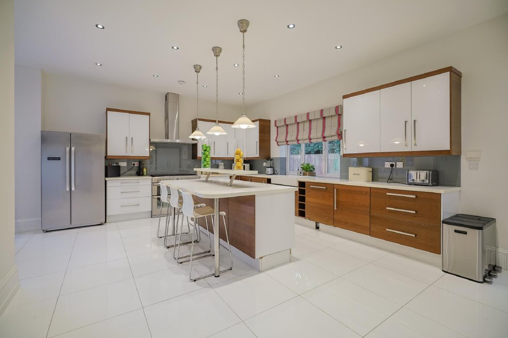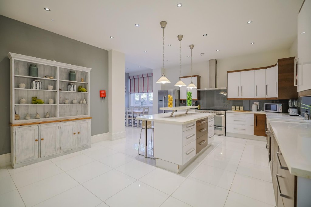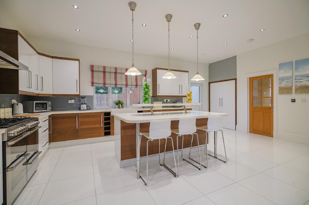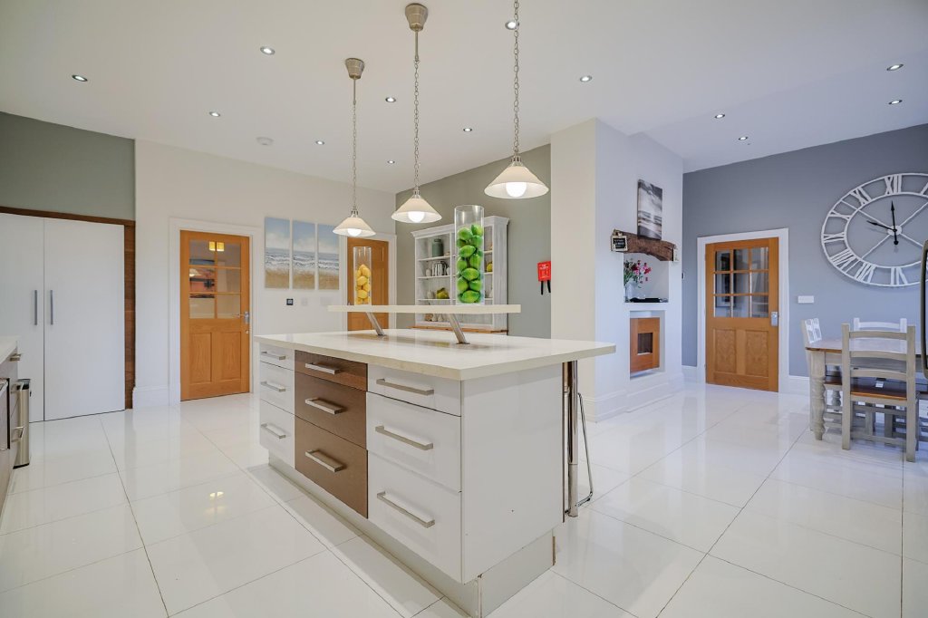 The modern kitchen/breakfast room boasts tiled flooring with underfloor heating, spot and feature lighting, a feature electric fireplace and dual-aspect windows. The kitchen is well equipped with a range of wall and base units, a double porcelain sink, integrated Smeg dishwasher, Stoves Sterling double oven, grill, warming drawer, and a 7-ring gas hob with an elevated extractor fan. There is a large kitchen island with extra storage and a breakfast bar for three stools, and space for an American-style fridge/freezer. Ample space remains for a breakfast table or seating area, an ideal family zone. From here, you have access to the study, the secondary stairway, the boiler room and the rear garden.