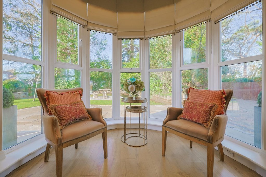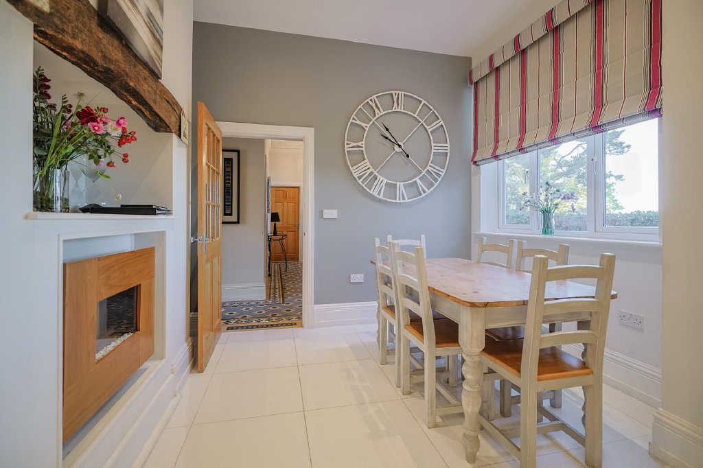 First on your right is the impressive dining room, where a floor-to-ceiling bay window overlooking the beautiful grounds draws your eyes instantly, flooding the room with natural light. An additional large rear window enhances the airy feel, while oak flooring, high ceilings with detailed coving and a ceiling rose, spotlights and central lighting create a refined atmosphere. A gorgeous oak feature fireplace provides a stunning focal point, and the generous proportions allow space for a large dining set, perfect for entertaining loved ones.