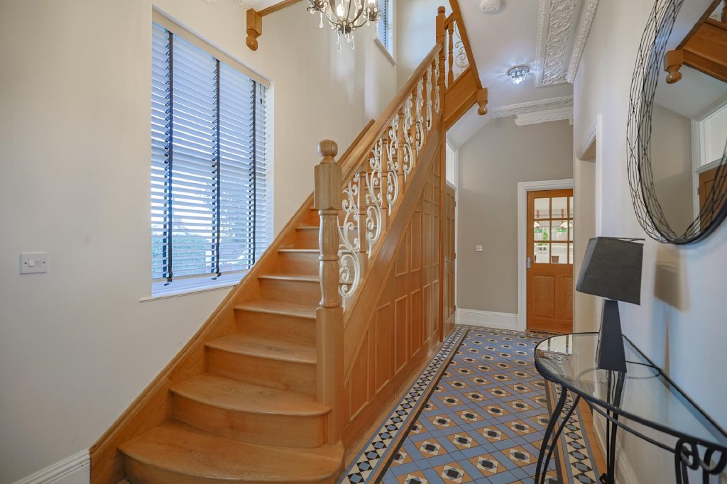 Immediately upon stepping inside, the traditional features capture your attention. High ceilings adorned with detailed coving and a ceiling rose complement the superb patterned tiled flooring with underfloor heating. A window to the front fills the hallway with natural light, while an oak stairway with useful understairs storage leads to the first floor. From this welcoming entrance you gain access to all the main living areas as well as a cloakroom.