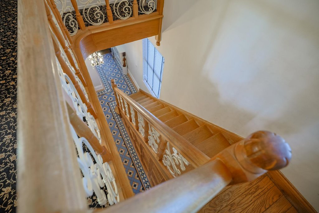 Returning to the entrance and ascending the oak staircase, you arrive at a spacious carpeted landing with high ceilings and detailed coving. Two windows to the front and an additional window to the rear allow natural light. From here, access is provided to five bedrooms, the family bathroom and a large storage cupboard.
