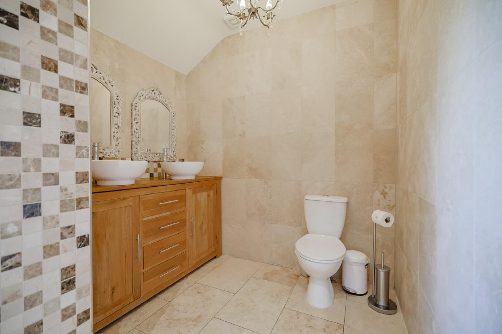 The family bathroom is furnished with a WC, twin wash basins with storage beneath, a feature bath with freestanding tap and handheld shower head, spotlighting, extractor fan, heated towel rail, tiled flooring and tiled walls, as well as a frosted rear window.