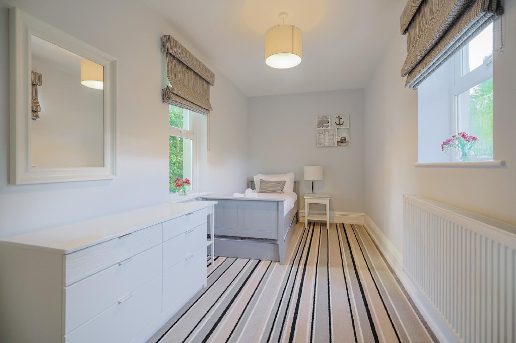 Bedroom four is a generous double bedroom with dual-aspect windows offering natural light and views over the grounds. The room includes carpeted flooring and a built-in wardrobe with fitted shelving and a hanging rail.