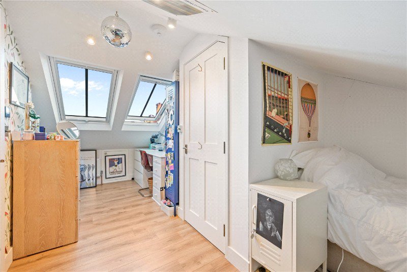 Upstairs, the first floor includes three bedrooms – one being the principle bedroom to the front (currently being used as a second living space), a double bedroom with vaulted ceilings overlooking the gardens to the rear, and a single bedroom – ideal as a nursery or home office. The family bathroom is a three piece tiled suite with underfloor heating, heated towel rail and storage cupboard. The well designed hallway really opens up the space by completely vaulting the ceiling, with staircase leading to the loft bedroom.
